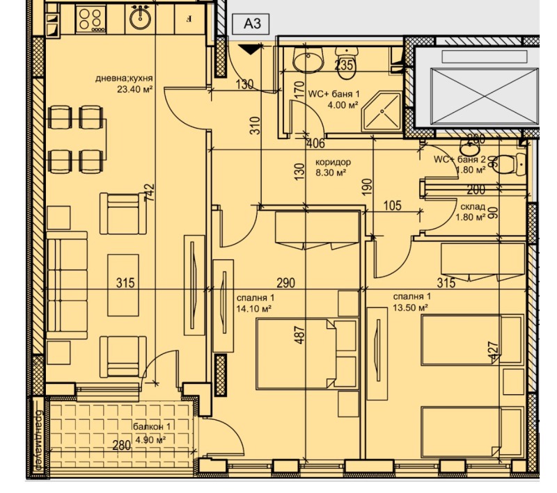 🟡 Разпределение: Всекидневна + кухненски бокс, родителска спалня, детска спалня, 2баня+тоалетна, разположени на площ от 99,74кв.м.