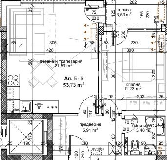 🟡Разпределение: Всекидневна+кухненски бокс, спалня, баня+тоалетна, тераса, разположени на чиста площ от 53,73кв.м.