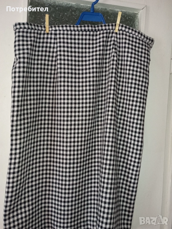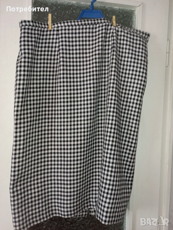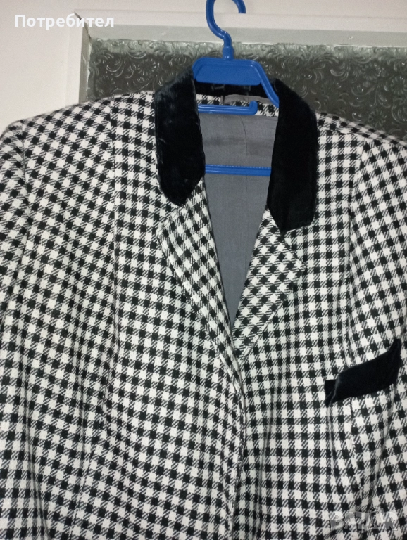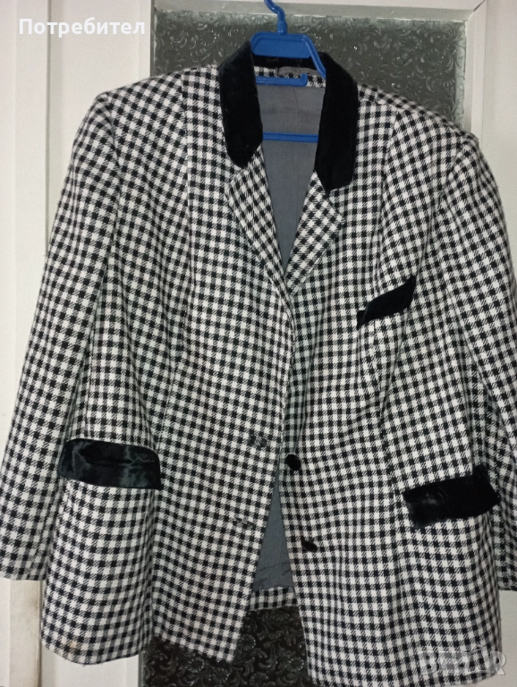 Продавам дамски костюм – пола и сако. Материята е мека и приятна за носене. Яката и джобчетата са красиво декорирани. Сакото и полата са с хастар. Сакото има 2 джоба . Размерите на сакото са: ширина при раменете – 47 см; ширина от мишница до мишница – 62 см ; дължина – 75 см; дължина на ръкава – 58 см. Полата е с цепка отзад. Размери на полата: талия – 106 см ; ханш – 130 см; дължина – 75см;