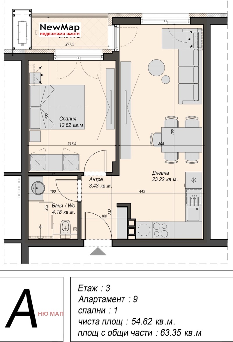 Апартамент с просторна дневна с кухненски възел, една спалня, баня с тоалетна и тераса. Чиста площ на апартамента от 55 кв.м.
