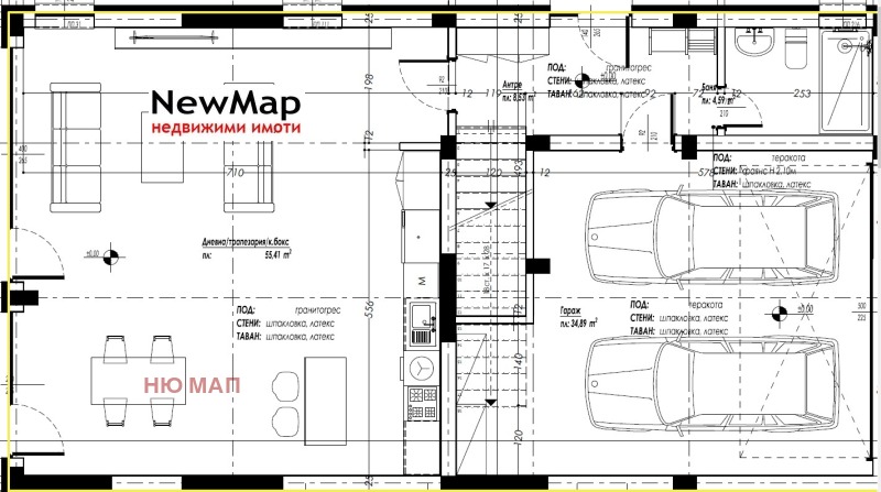 Разпределение на първия етаж: Двоен гараж за автомобили с автоматична секционна врата с дистанционно управление с чиста площ от 35 кв.м., от който се влиза директно в антрето от 9 кв.м.; Дневна с кухненски възел и трапезария с чиста площ от 55,41 кв.м. с френски прозорци за максимален комфорт и осветеност; баня и двураменно вътрешно стълбище към втори етаж.