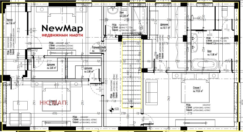 Разпределение на втори етаж: Родителска спалня с чиста площ от 20 кв.м. с прилежащи дрешник от 10 кв.м. и самостоятелна баня от 11 кв.м. с достатъчно място за широка душ кабина и за вана или джакузи; Две просторни спални всяка от които със самостоятелен дрешник и втора баня, обслужваща двете спални. От тях се излиза на красива тераса от над 7 кв.м.