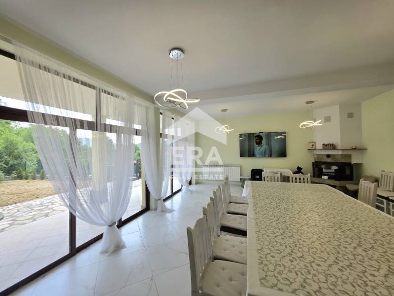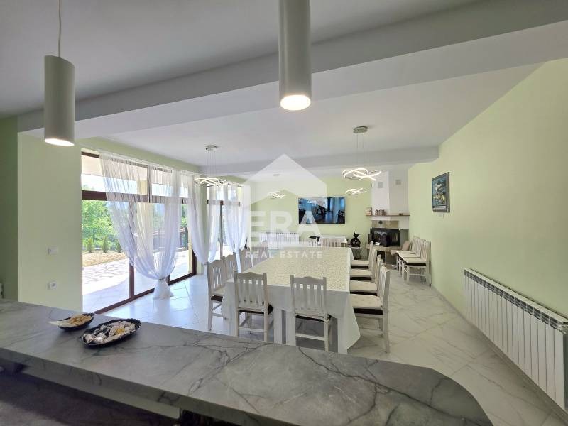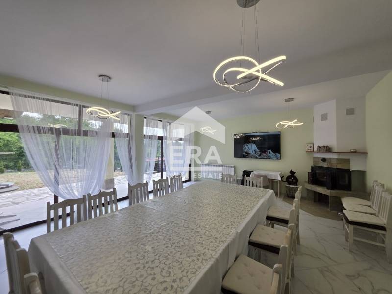 * Просторна дневна с уютна камина, напълно обзаведена с голяма трапезна маса, идеална за семейни събирания и приятелски вечери.