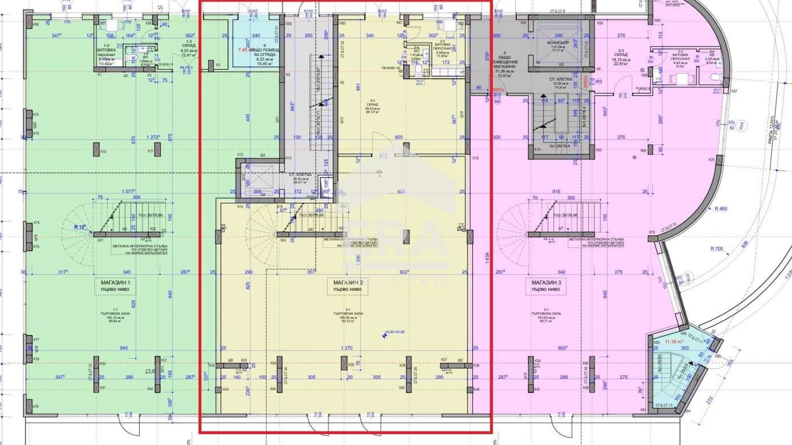 Помещенията са с внушителна площ и предлагат функционално разпределение, което лесно може да се адаптира към различни бизнес нужди: