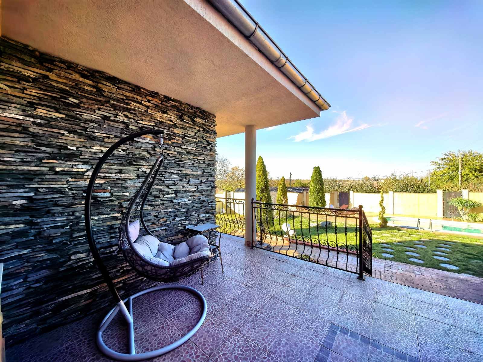 Алеи от щампован бетон водят до две масивни беседки, които придават завършеност на двора. В първата е изградена напълно оборудвана лятна кухня с барбекю идеално място за празници и приятелски вечери. Втората е по-интимна, с кът за отдих, санитарен възел и просторна стая, подходяща за гости. Наблизо е разположен басейн с професионална филтрация и автоматично почистване.