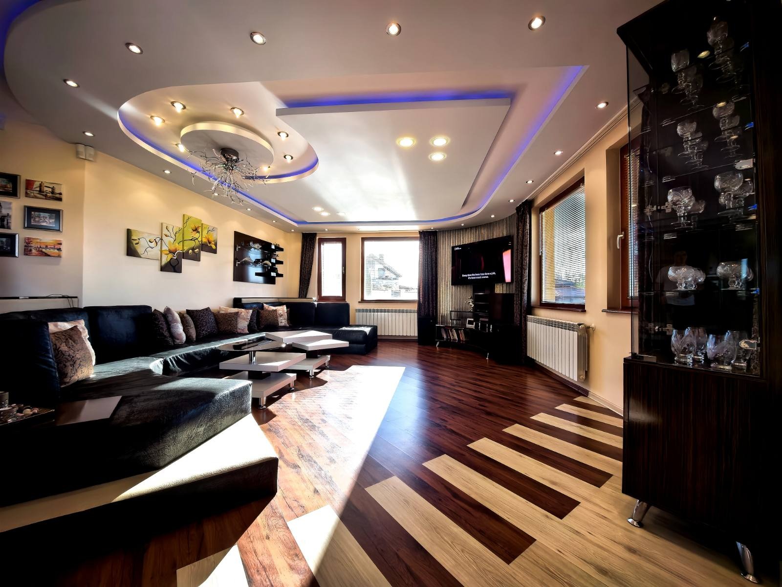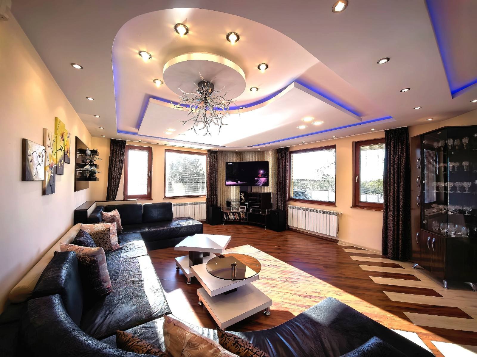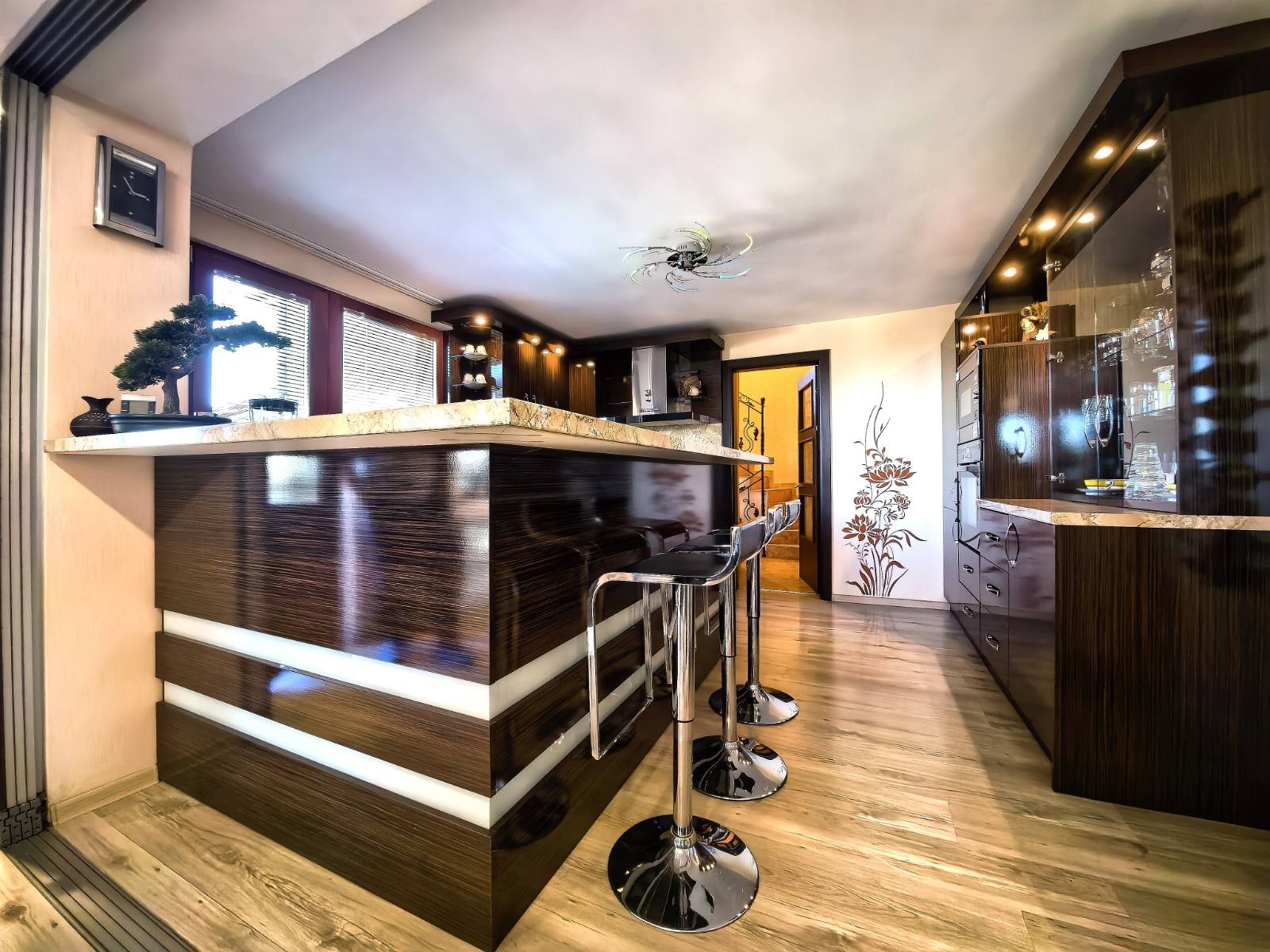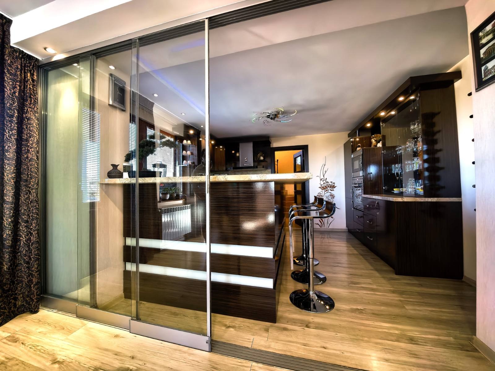 Вътрешното пространство се разгръща на полуетажи с функционална лекота. Всекидневната, кухнята и трапезарията са обединени в едно цяло, разделени от елегантна витрина от закалено стъкло. Оттам се излиза на обширна веранда с гледка към басейна и градината. В близост се намират перално помещение и баня с хидромасажна вана, кабинет с тераса и избено помещение. Гаражът има топла връзка към къщата, автоматична врата и нагревател против замръзване. Котелното помещение е оборудвано с професионална отоплителна система с алуминиеви радиатори във всички помещения.