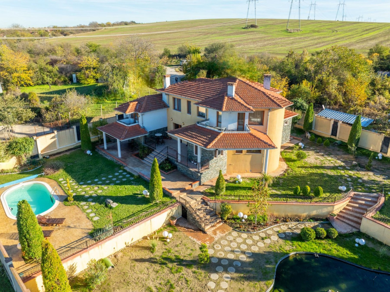 Целият имот е проектиран с мисъл за автономност и устойчивост. Изградена е фотоволтаична централа с мощност 20 kW и батерии от 40 kW, която осигурява пълна енергийна независимост и значително намалява разходите.