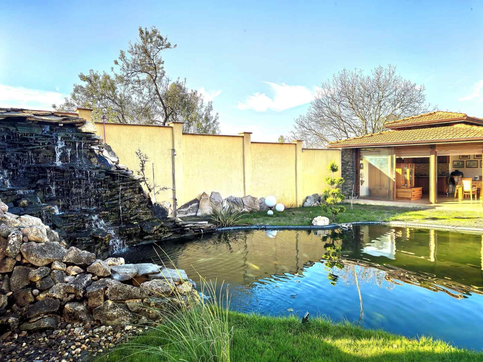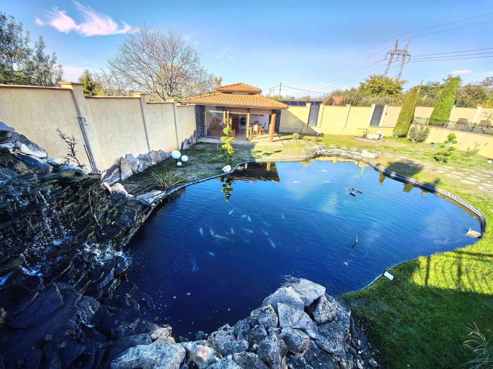 Акцент във двора е изкуствено езеро със голям скален водопад. Дълбочината на езерото варира до 170 см дълбочина. В него целогодишно обитават японски шарани някои от тях достигащи над половин метър. Това е хоби изискващо любов и внимание. Под водопада има изградена стая с професионална филтационна система и цялото необходимо оборудване за поддръжката. Имотът разполага със собствен регистриран сондаж, хидрофорна система, капково напояване с програматор, ВиК мрежа, свързана към две кооперации. Сондажът напълно задоволява нуждата от вода за цялото домакинство, за целогодишната експлоатация на басейна и езерото. Целият терен от 4, 2 дка е с свързан към сондажа осигуряващ капково напояване необходимо за отглеждането на много плодни дръвчета. Като допълнителни преимущества са, видеонаблюдение, СОТ.
