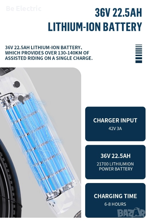 Оборудван с батерия 36V 22.5Ah, той предлага асистиран пробег от 130–140 км и максимална скорост от 25 км/ч.