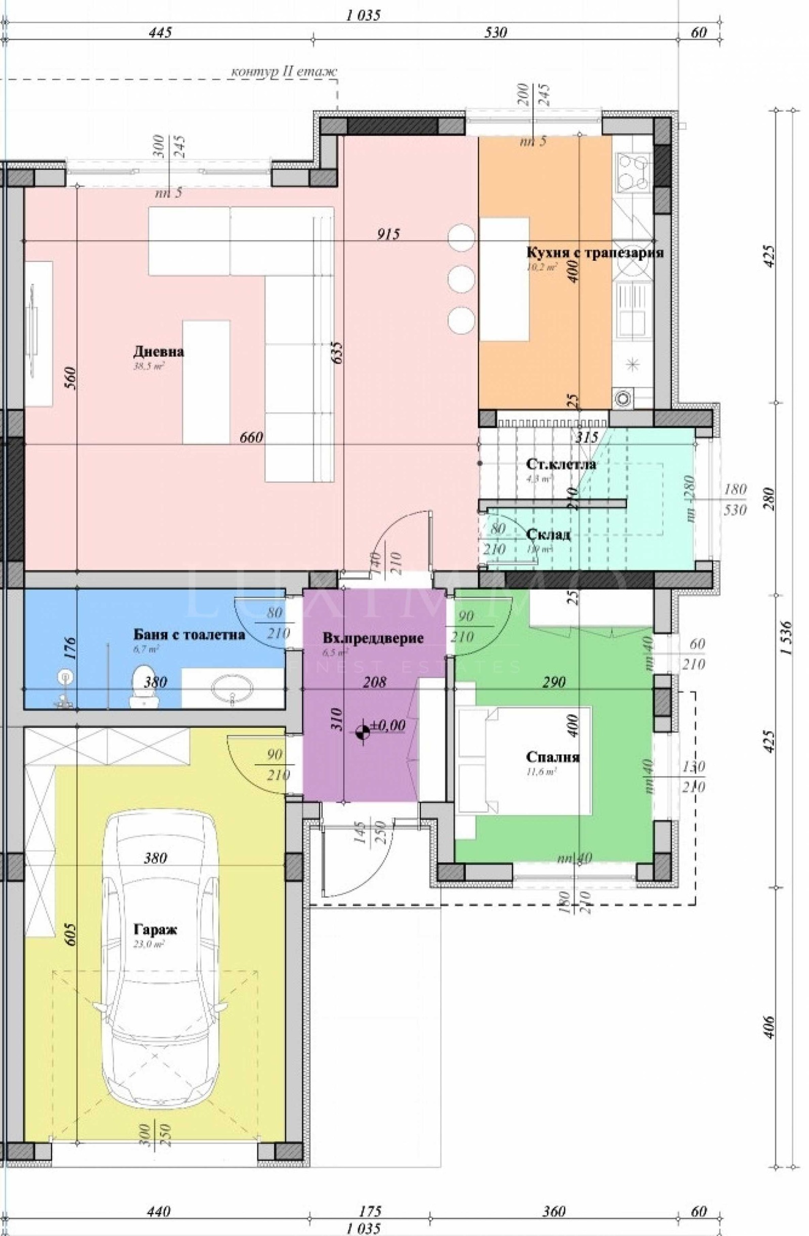 първо ниво - просторна всекидневна, трапезария и кухненски бокс от 48.70 кв.м, баня с тоалетна, преддверие, спалня, склад, стълбище;
