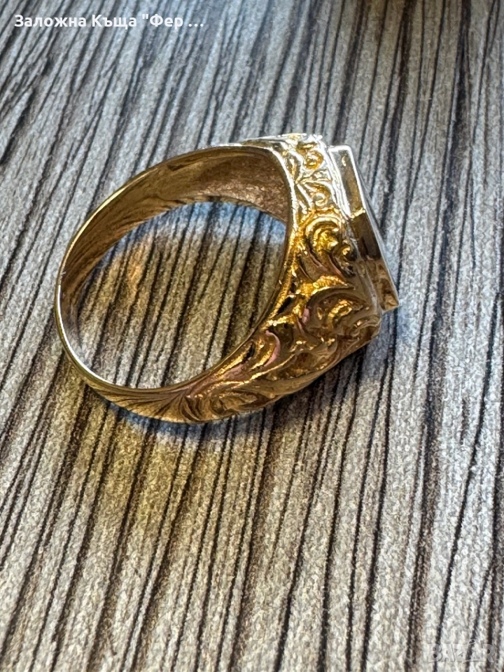 Пръстена е нов, поръчков. Не е носен. 9гр тежи, проба 585 14 карата. Отгоре на плочката може да си поставите ваша златна буква. За хората които не са запознати, пръстена леко червенее, защото златото е с мед, а не както обикновено със сребро. Такъв тип е и руското злато.