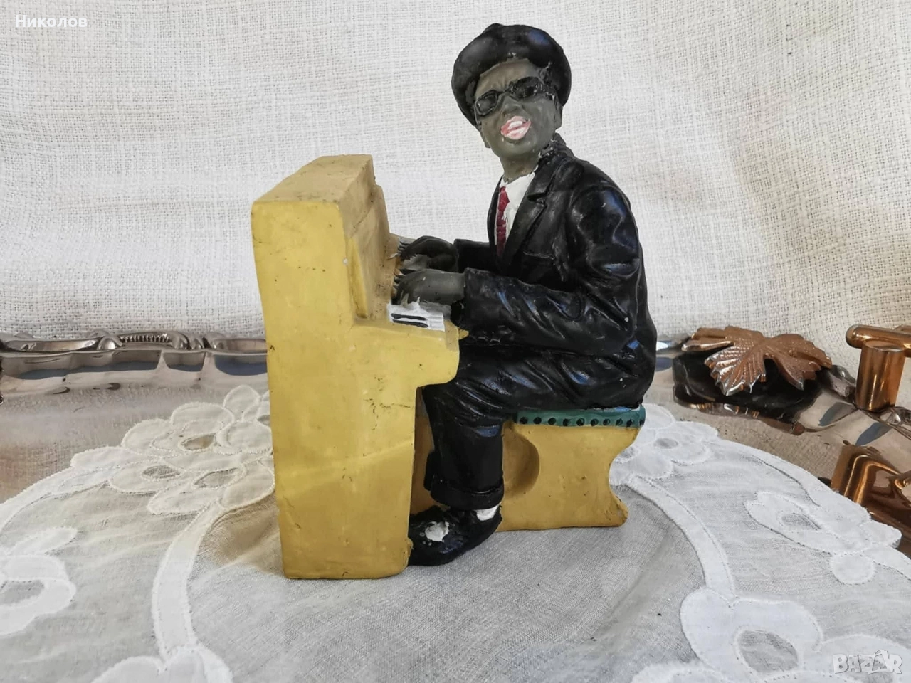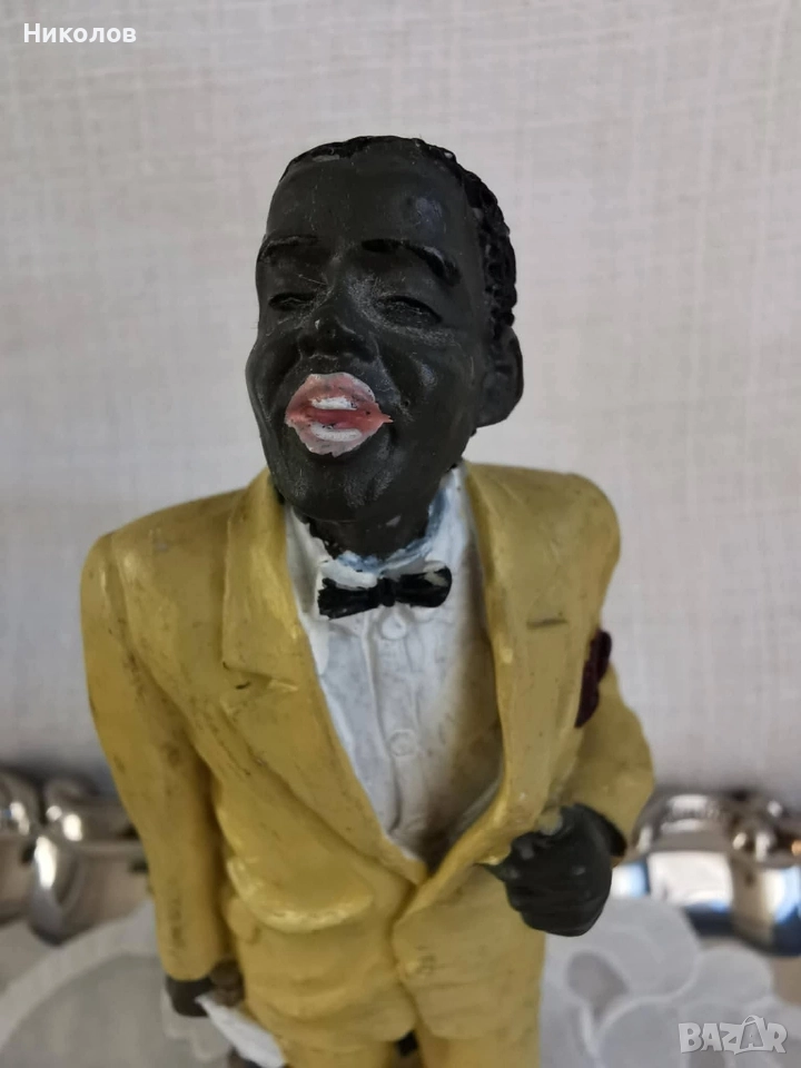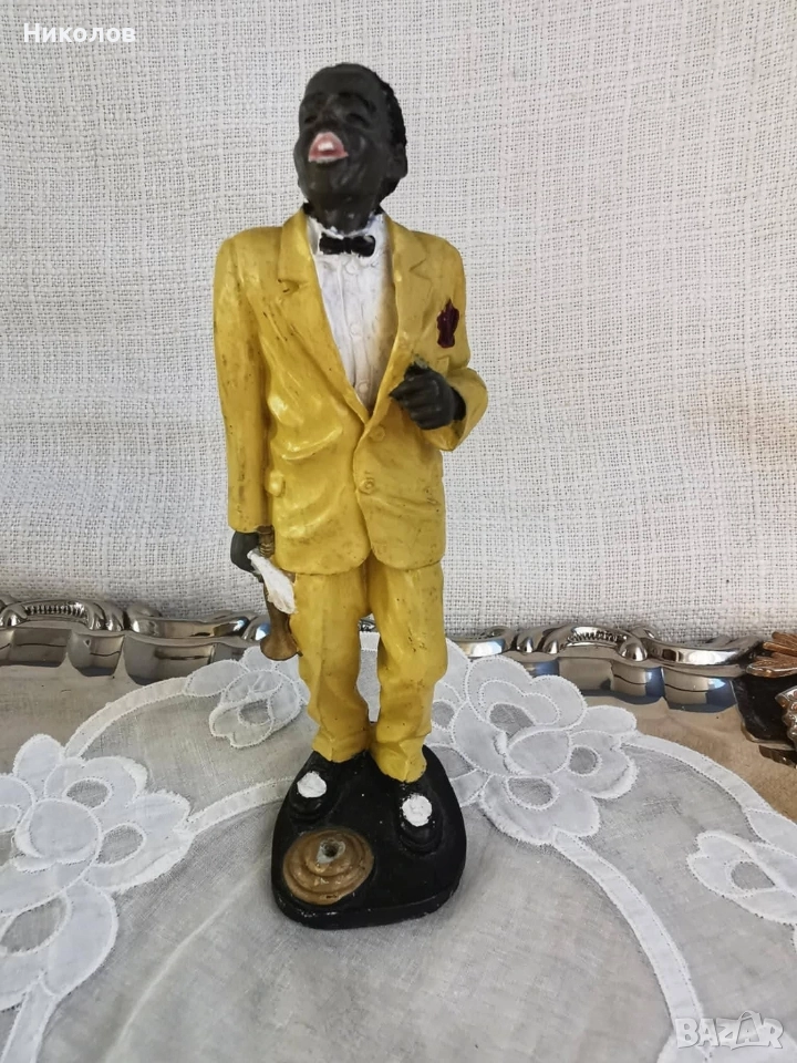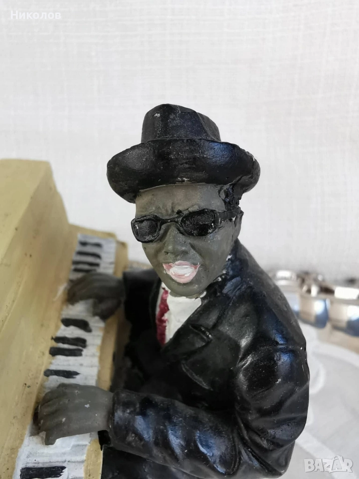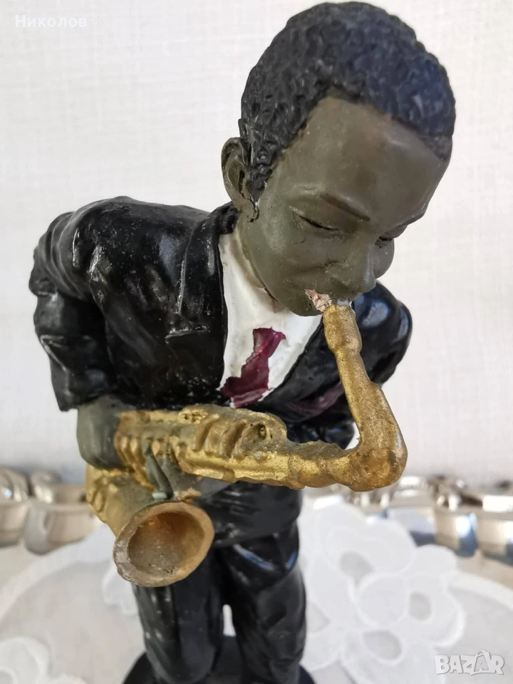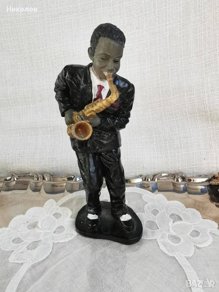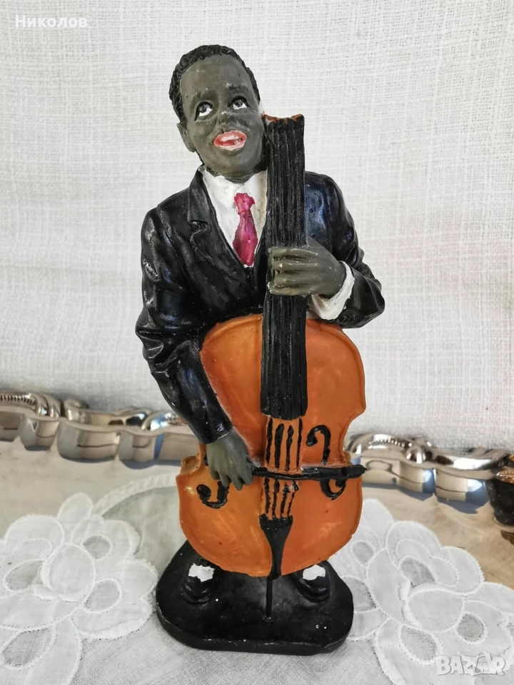 Музиканти – винтидж колекция за интериор Полирезинови фигурки, оформени като джаз квартет – пианист, певец, контрабасист и саксофонист. Всяка фигурка е с детайлна визия, характерна за по-старите декоративни серии. Пианист – седнал пред жълто пиано, височина около 12 см Певец в жълт костюм – около 16 см Контрабасист – около 16 см, със забележка, поради което е подарък към останалите Саксофонист – около 16 см Цена за трите основни фигурки + контрабасиста като подарък: 38 лв (19.43 EUR)