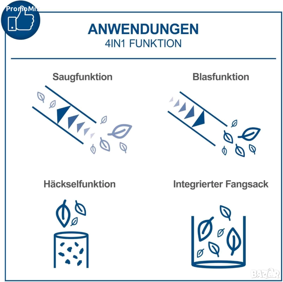листосъбирач, който комбинира 4 функции в 1 – мощно издухване, засмукване, събиране на отпадъци и функция за мулчиране.