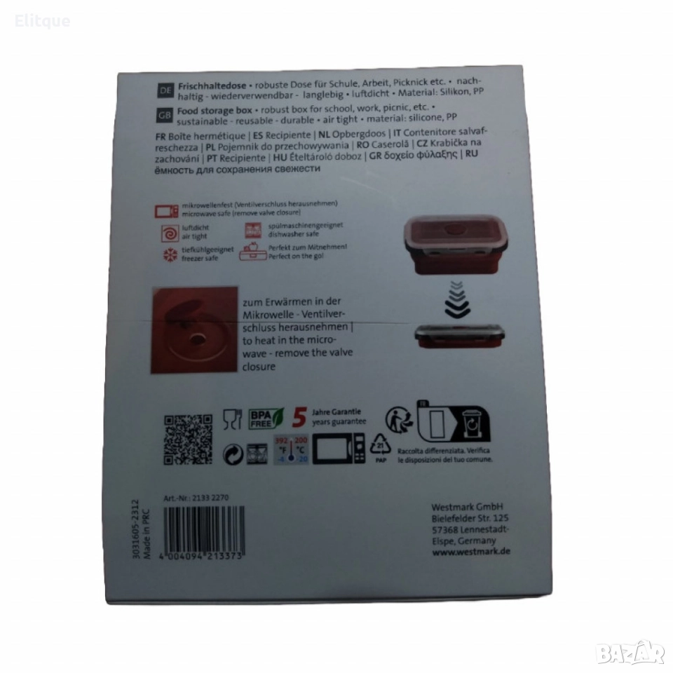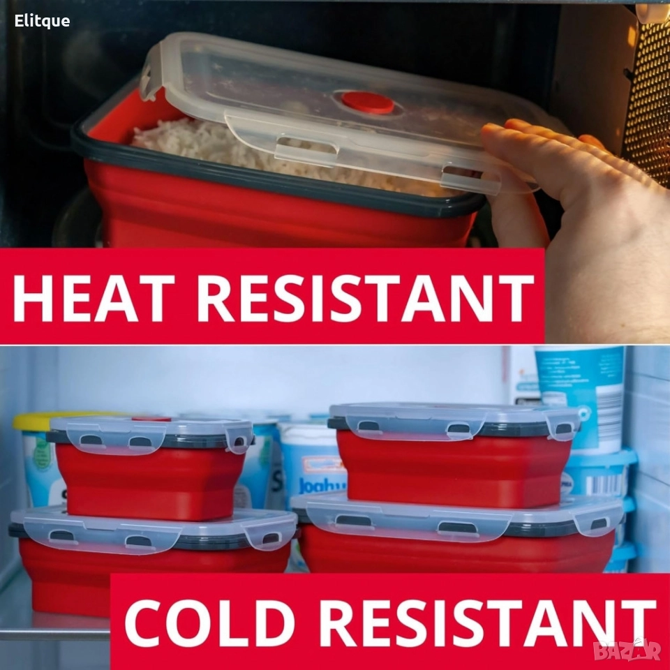 Материал: Полипропилен (PP) и силикон; Безопасност: Без BPA, подходящ за хранителни продукти; Функционалност: Подходящ за съдомиялна машина, микровълнова фурна и фризер; Форма: Правоъгълна; Херметично затваряне: Да; Сгъваема конструкция: Да.