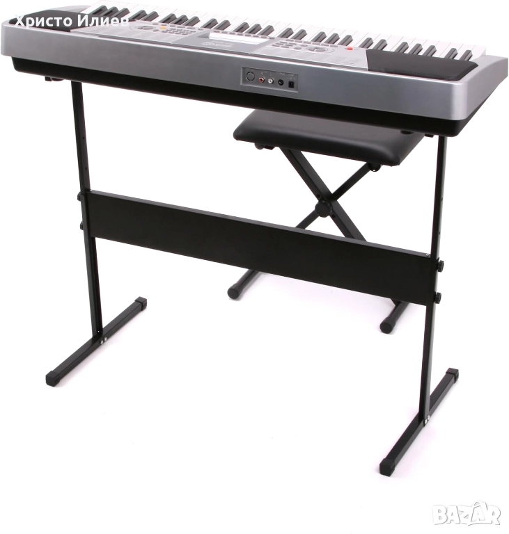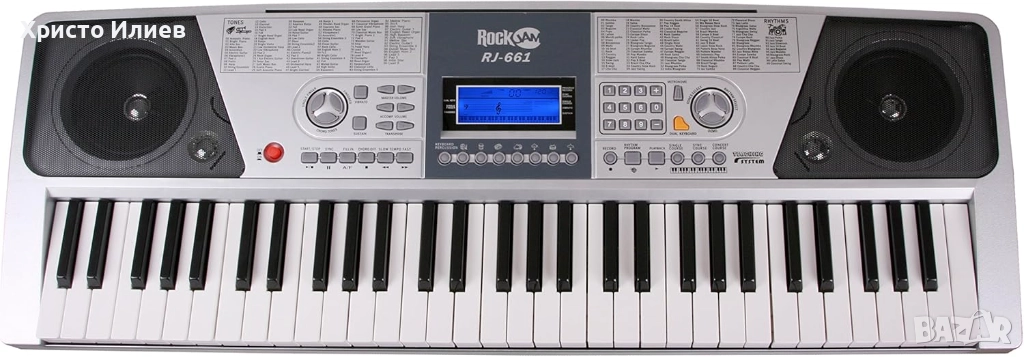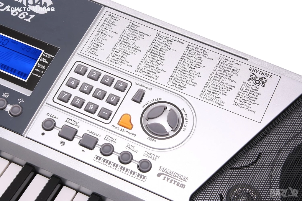 Компактна дигитална клавиатура с 61 клавиша в пълен размер, LCD екран, функция за запис и възпроизвеждане, 100 тона на клавиатурата, 100 ритма и 50 демонстрационни парчета.