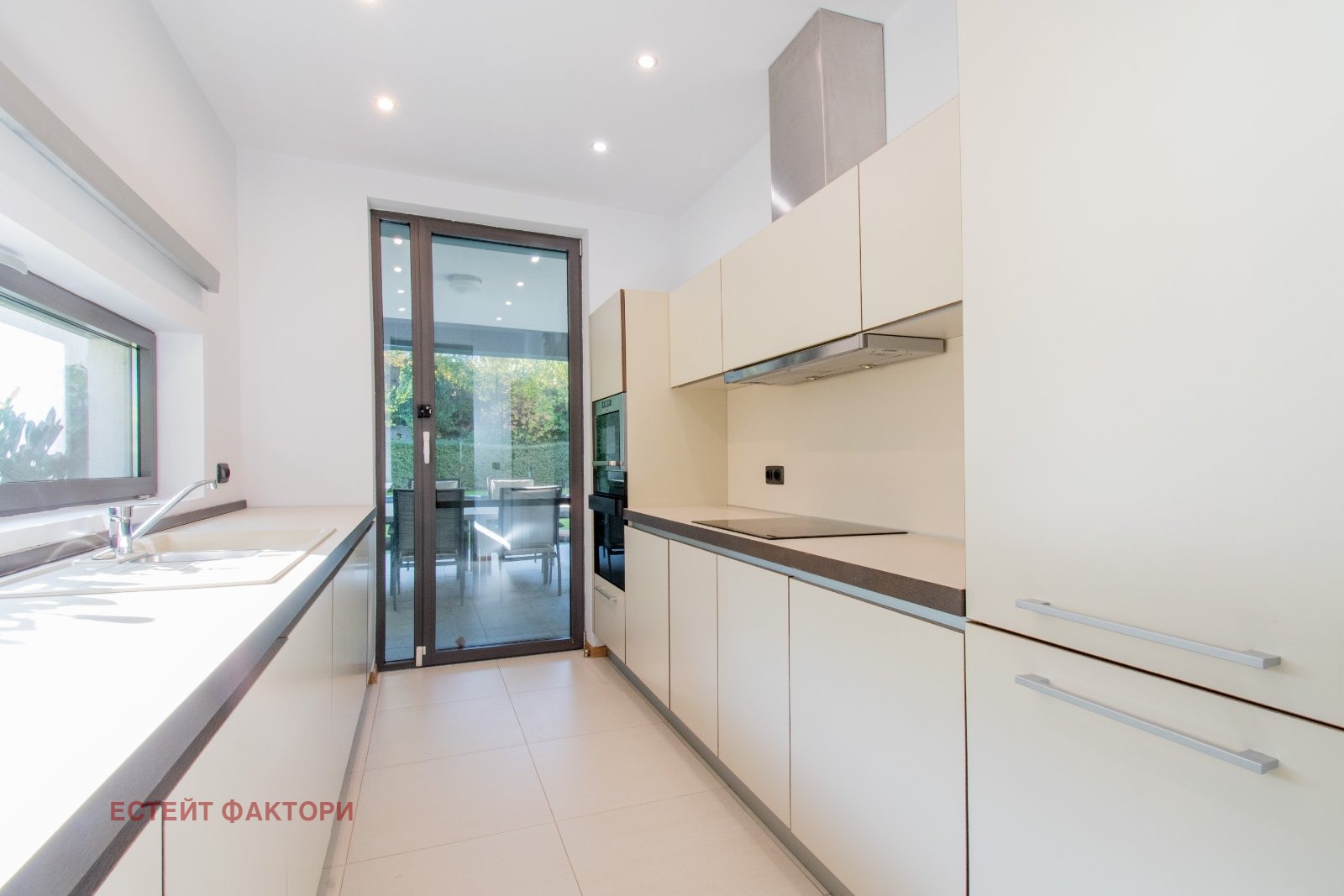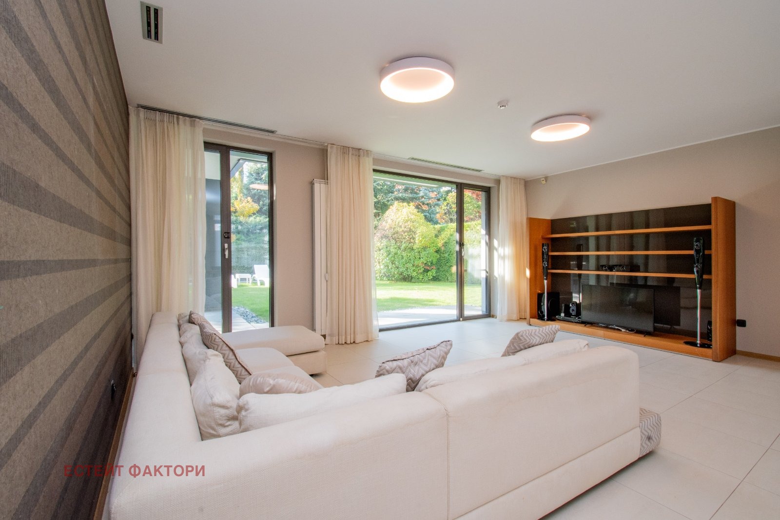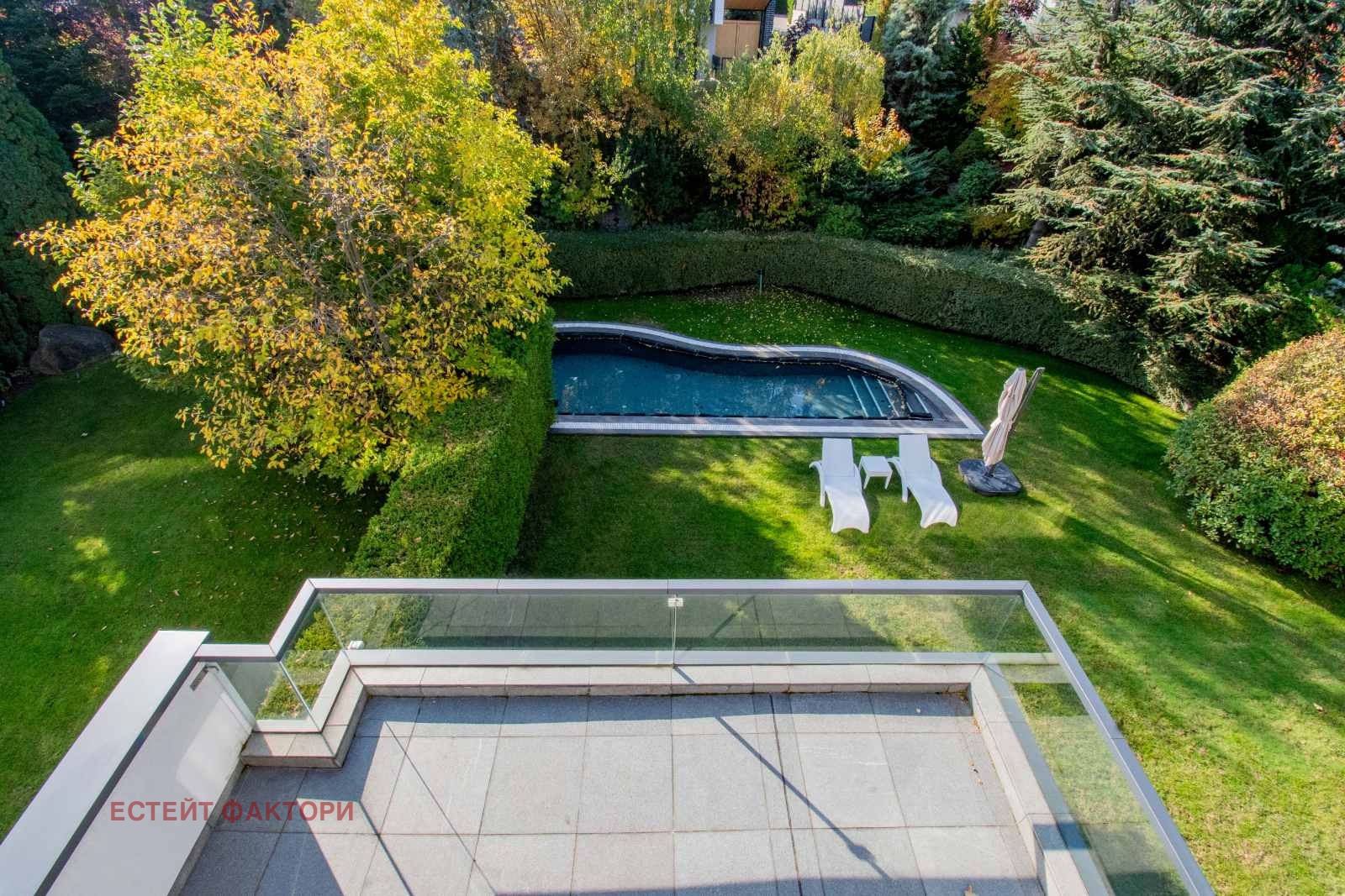 Първи етаж: прекрасна просторна дневна с площ 60 кв.м. с директен излаз към градината и басейна, самостоятелна кухня, баня със санитарен възел.