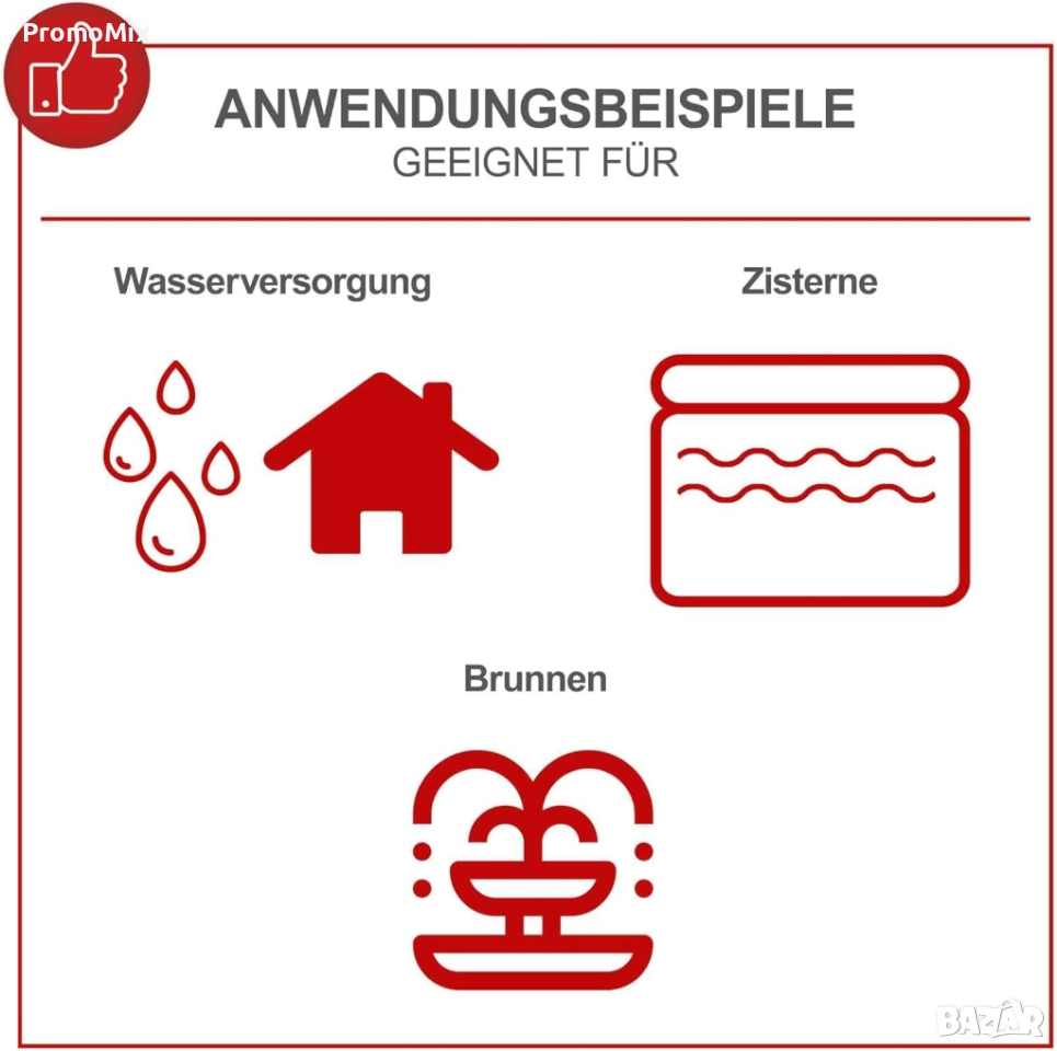 Помпата може да засмуче вода от дълбочина до 8 метра и да я изтласка до височина 36 метра над нивото си, осигурявайки мощно подаване към кранове, градини или поливни системи.