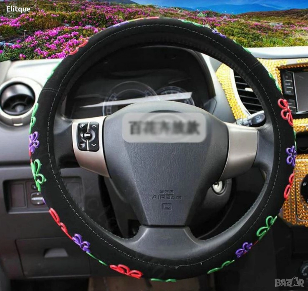 Дамският калъф за волан с черно кадифе и апликации на цветя е перфектен избор за всеки автомобил, който се нуждае от стилен и удобен аксесоар. Този продукт съчетава в себе си елегантен дизайн и функционалност, като осигурява комфорт и сигурност по време на шофиране. Възползвайте се от качеството и красотата на този уникален калъф, който ще придаде нов живот на интериора на вашия автомобил. Материал: Черно кадифе с цветни апликации; Размер: Подходящ за волани с диаметър 38 см; Цвят: Черен с цветни апликации на цветя; Пакетът включва: 1 брой калъф за волан.