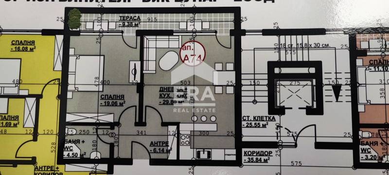 Предлага в затворен комплекс за продажба двустаен апартамент с чиста жилищна площ от 78,81кв.м. Жилището е на пети етаж и е със следното разпределение: Антре, баня и тоалетна, дневна с кухненски бокс с излаз на тераса и спалня с излаз на тераса. Апартаментът е с изложение Север. Сградата е проектирана с изключително внимание към функционалността и комфортът на бъдещите жители. Дневните пространства са светли и просторни. Апартаментът се издава на шпакловка и замазка с монтирана външна блиндирана врата. Строителството е с висококачествени материали и съвременни технологии, което гарантира удобство и уют.