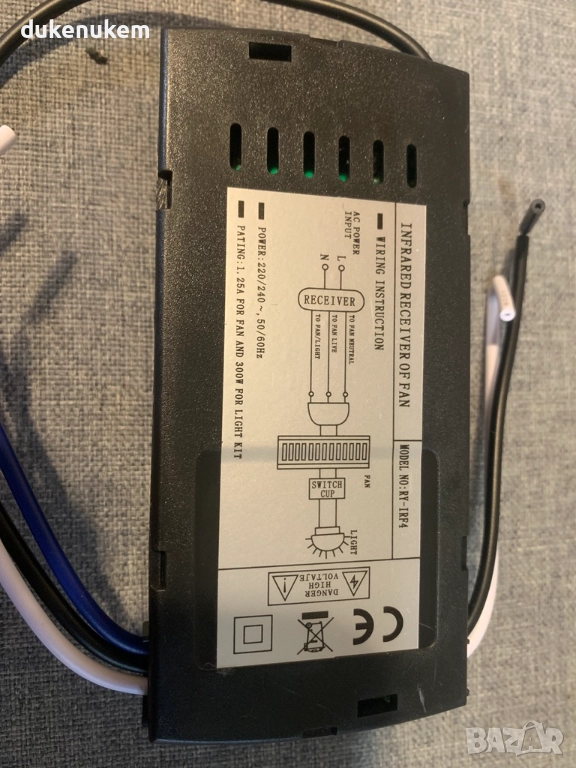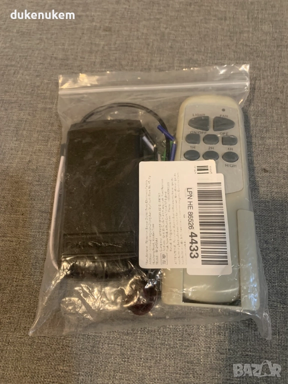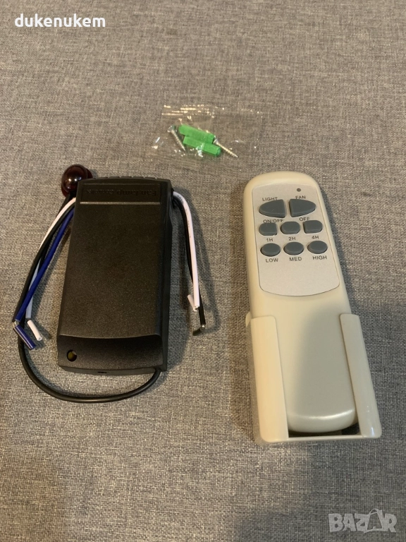 Комплектът включва приемник, дистанционно и винтове. Приемникът се свързва към таванния вентилатор, а дистанционното е с удобни гумени бутони. Включена е и поставка за стена.