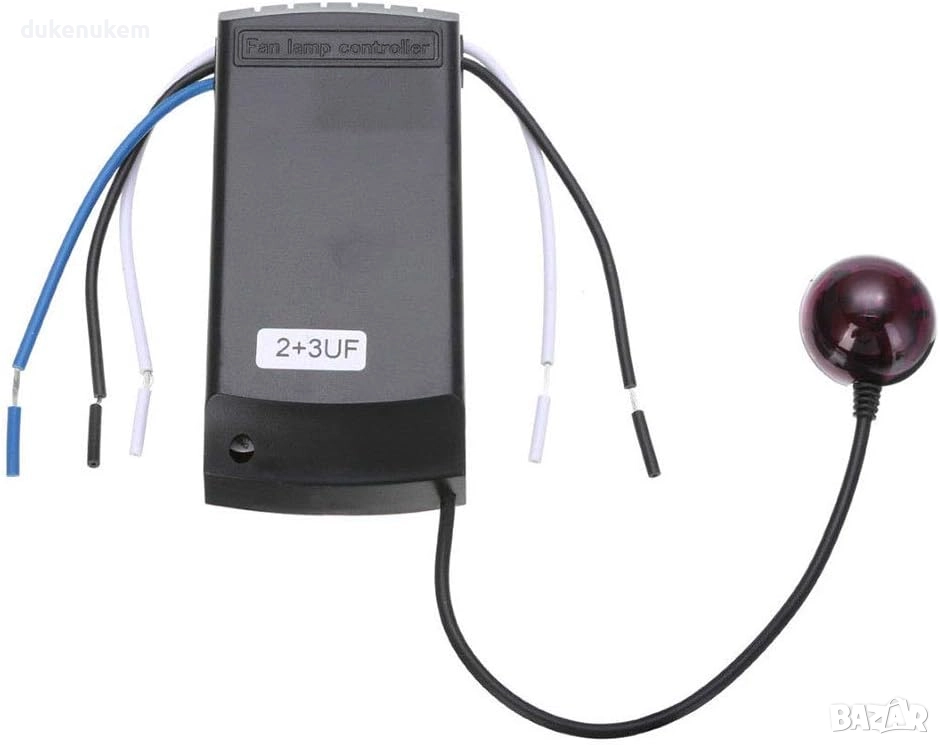 Подходящо за повечето декоративни таванни вентилатори с осветление. Може да управлява светлина, скорости на вентилатора и таймер с едно дистанционно. Не е съвместимо с обикновени таванни вентилатори без лампа, настолни и подови вентилатори.
