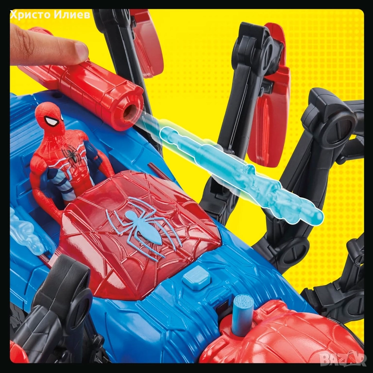 Играчката за кола Spider-Man може също да взривява включени снаряди с мрежата. Бутайте превозното средство Spider и гледайте как всичките 8 крака се движат и пълзят като паяк. Представете си как побеждавате враговете на Спайдърмен, като ги улавяте в подобната на клещи хватка на Crawl 'N Blast Spider.