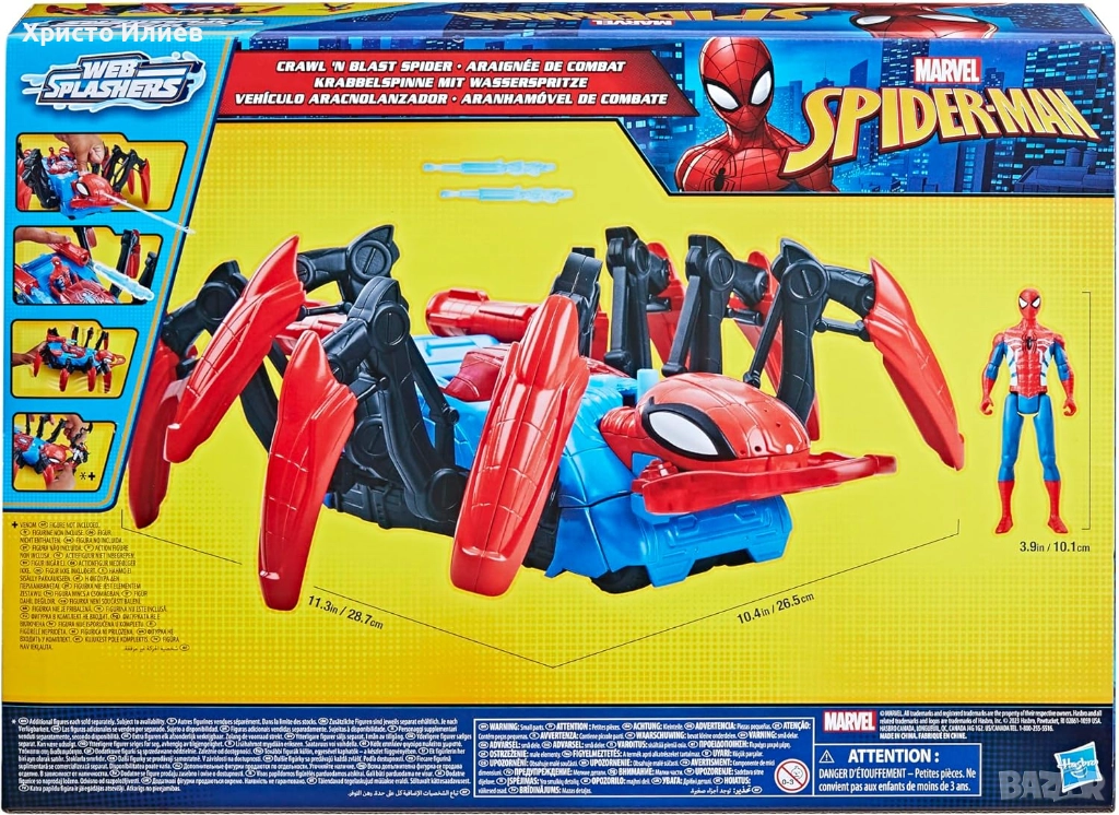 Този комплект играчка кола включва 10 сантиметрова фигурка на Спайдърмен, която децата могат да поставят в Crawl 'N Blast Spider. Деца на 4 и повече години могат да напълнят отделящата се глава на паяк с вода и да активират функцията за водна струя с натискането на един бутон!