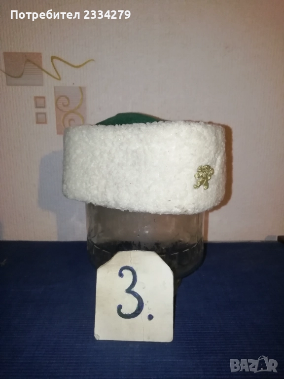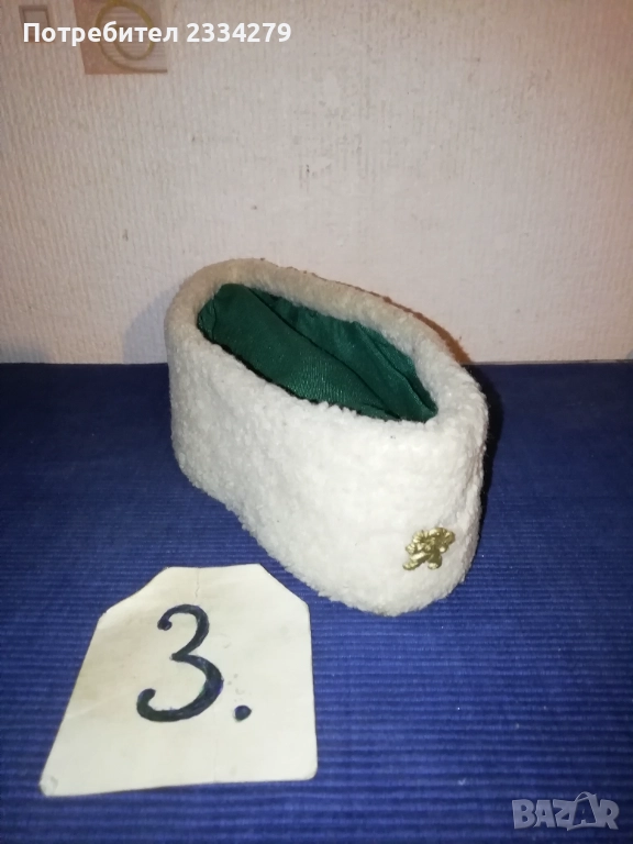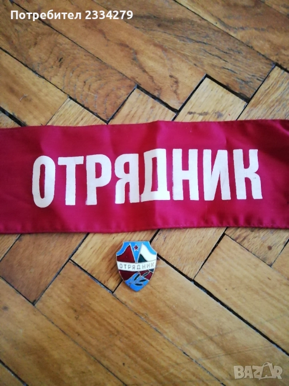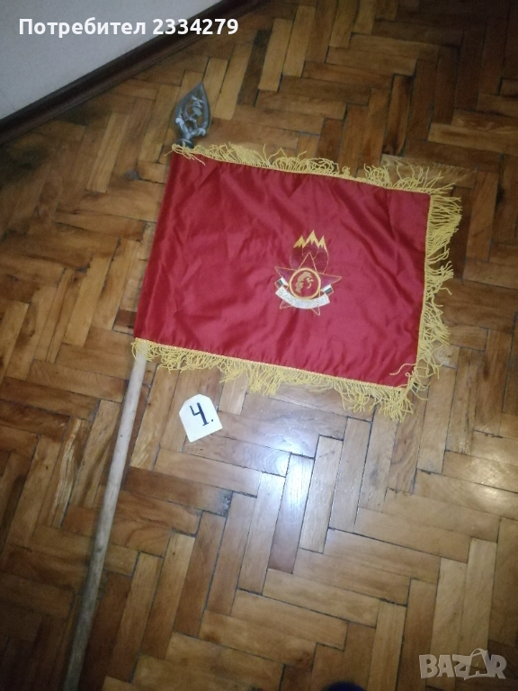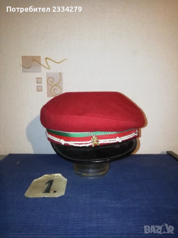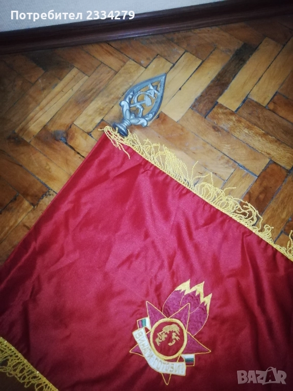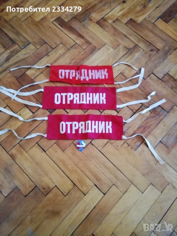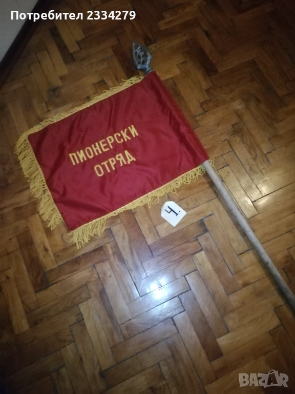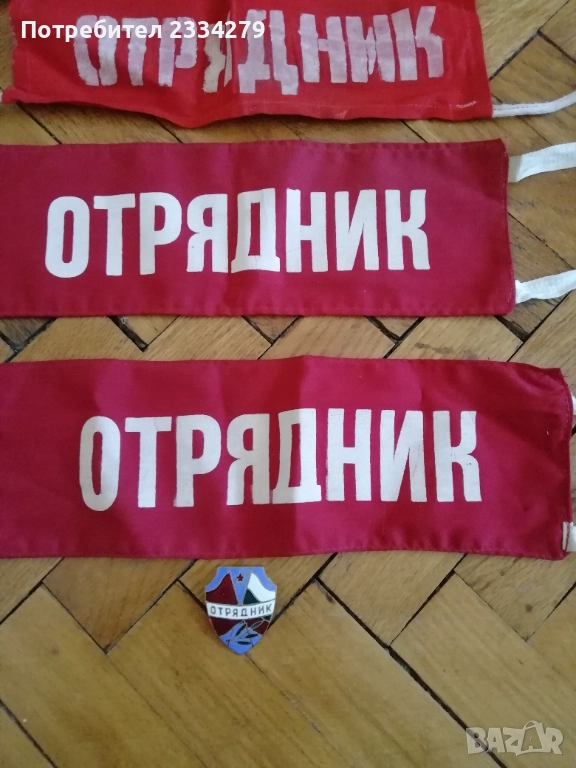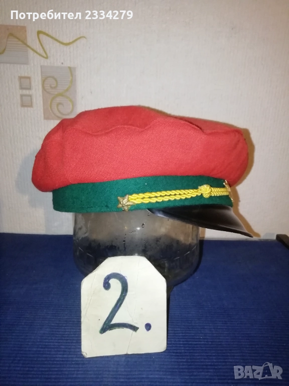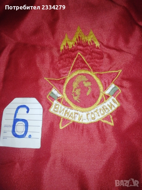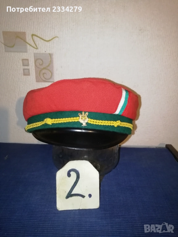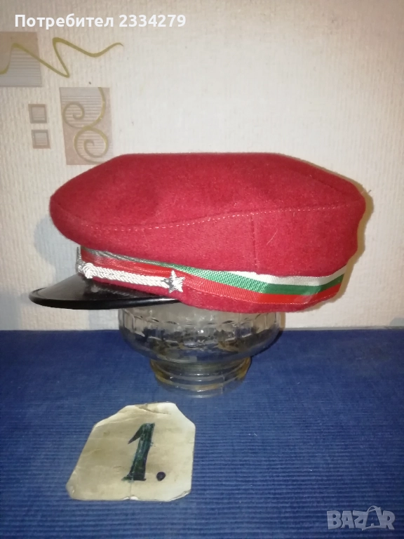 знамена и шапки използвани в тържества, манифестации и други тържества по времето на Соца. N:1 стара шапка с трикольор, цена 10€.; N:2 ученическа шапка от 1957год. използвана в музиканти в духова музика, цена 15€.; N:3 ученическо калпаче ползвано при тържества, цена 9€.; N:4 ученическо знаме, байрак с пика на върха сърп и чук, цена 35€.; N:5 ученически знамена 18€. за брой; N:7 лента за ръка и значка отрядник от 60-те години използвани от доброволци, проверяващи реда по комунизма, цена за комплект значка+лента 10€.