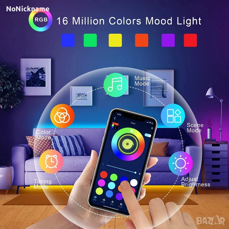 RGB LED лента 10m LED стайна лампа с APP контрол, гъвкава лента за декорация на стая, спалня, хол → Обява 52611257