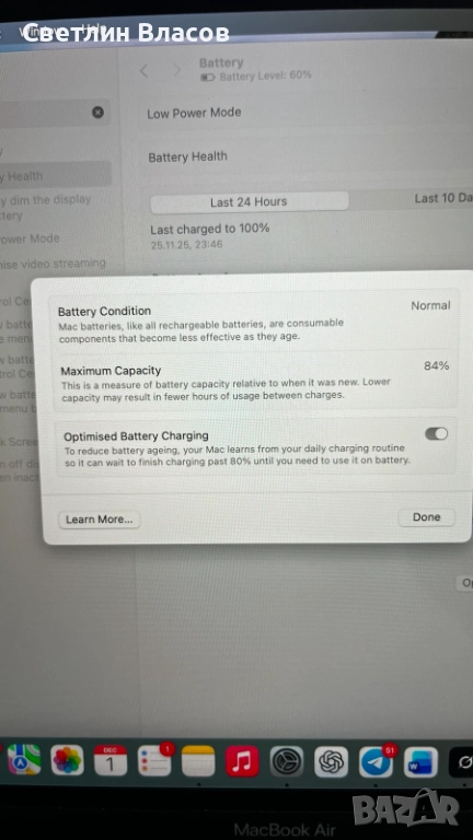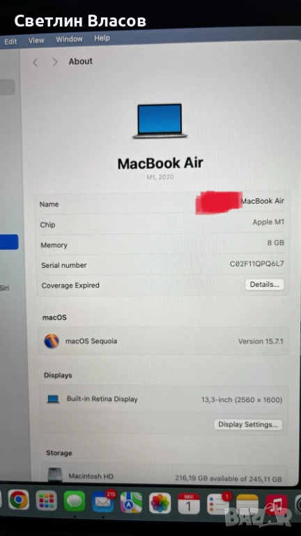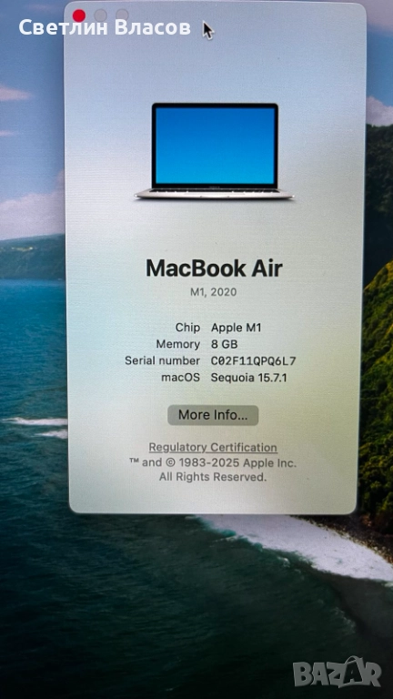 Лаптоп Apple MacBook Air M1 А2337(2020) 256GB / 8GB RAMс прекъсващ дисплей.