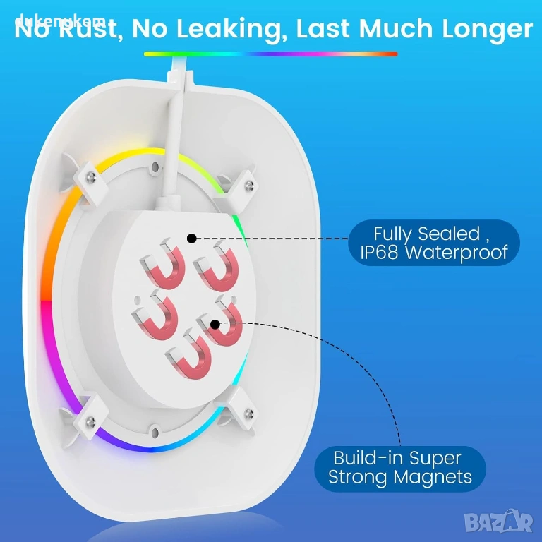 Лесен монтаж за всички видове басейни за минути – това магнитно осветление за басейн може да се закрепи здраво към всички басейни/повърхности със стоманени стени. Освен това, ние предлагаме метална основа за всички стени на басейни, които не са от стомана, за да закрепим магнитното осветление. Не е необходимо пробиване, монтажът е за минути, а демонтажът е лесен. Проектирано за употреба с надземни басейни, вградени басейни, спа центрове и навсякъде, където пожелаете.
