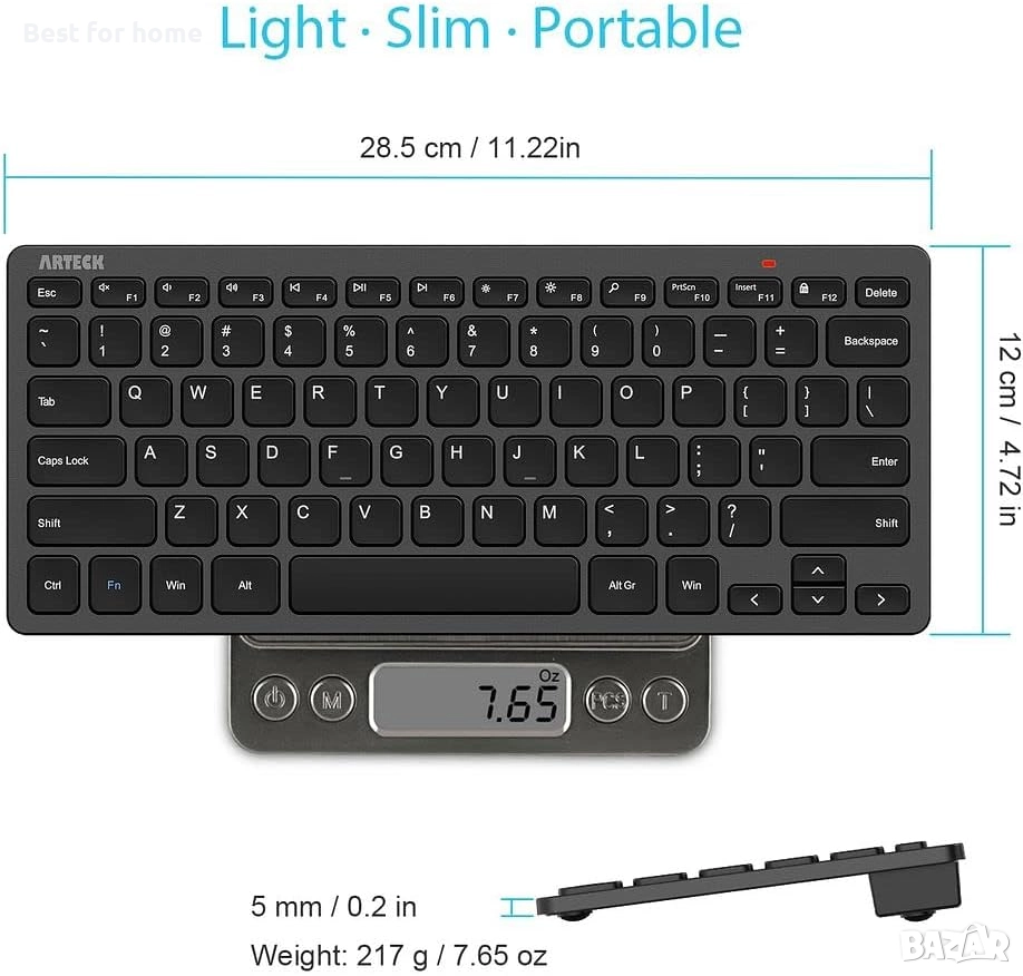 Ултра тънък и лек: Компактен размер (28.4 x 11.7 x 0.5 см) и леко тегло (218 г), но осигурява клавиши с пълен размер и бързи клавиши за удобно писане.
