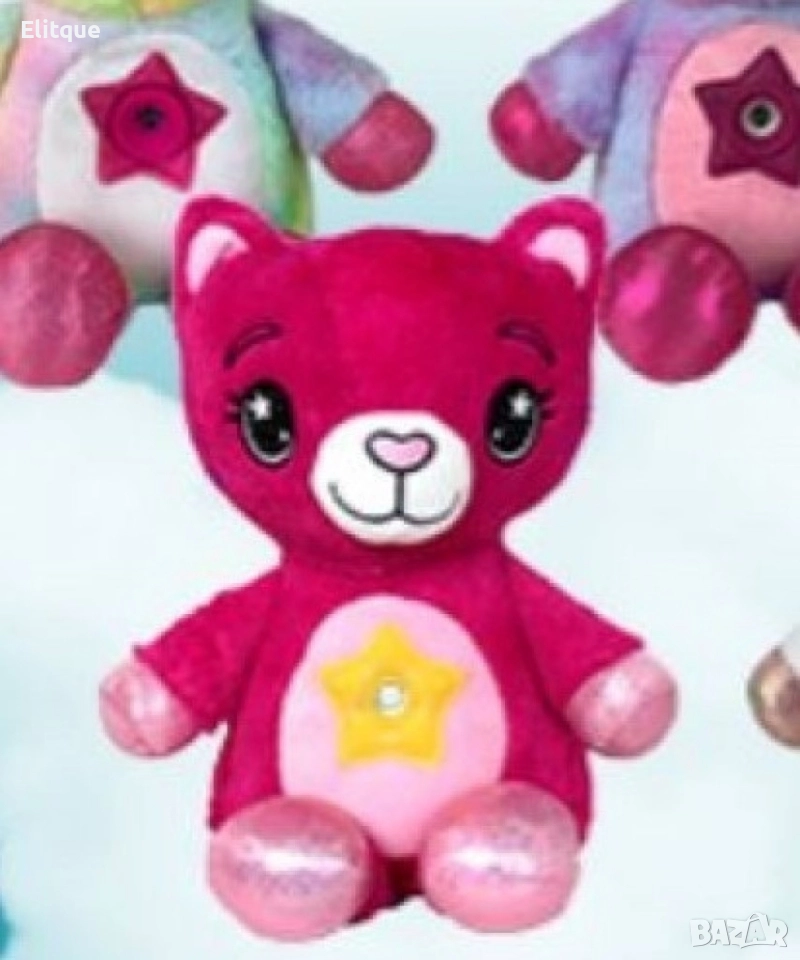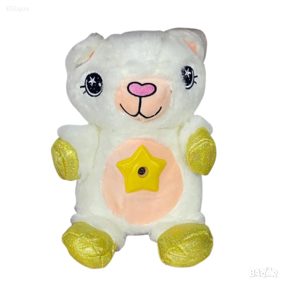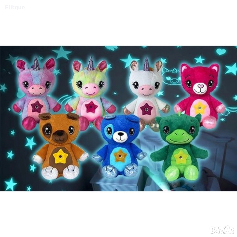 РАЗМЕРИ Дължина 37 cm Ширина 19 cm Височина 14 cm Описание Много малки деца не обичат тъмното, така че заспиването може да бъде по-трудно. Изненадайте детето си с тази светеща, плюшена играчка и направете заспиването лесно и забавно. След натискане на копчето, на коремчето се включва проекторът, който магически осветява тавана. Бавно движещите се звезди могат да светят в различни цветове, а след 20 минути угасват сами. Изработена от безвреден материал, което я прави напълно безопасна за употреба от най-малките, тъй като не съдържа малки и лесни за поглъщане частици. Меката светлина, приятната на допир материя и приспивните мелодии ще успокоят вашето дете и заспиването ще е лесно и вълшебно! Играчката работи с 3бр. батерии