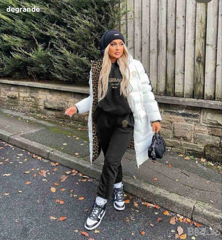 Лукс, стил и комфорт в едно – представяме ви изключителния дамски комплект от три части Versace. Моделът включва долница и горница от памук с вата за топлина и мекота, както и дълго зимно яке със силиконов пълнеж, което осигурява отлична защита в студените дни.