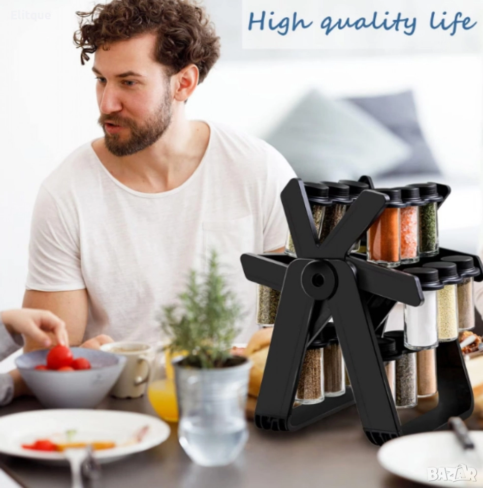 Въртящият органайзер за подправки с 18 стъклени бурканчета е идеалното решение за подредена и функционална кухня. Създаден да улесни достъпа до любимите ви подправки, този стилен органайзер запазва свежестта и аромата им. Изработен от висококачествено стъкло и снабден с въртяща се поставка, органайзерът е компактен и удобен за използване. Включва 18 бурканчета, идеални за съхранение на сол, пипер, кимион и други. Тип продукт: Комплект съдове за подправки; Предназначен за: Подправки; Материал бурканче: Стъкло, капак ABS; Функции: Въртяща поставка; Съдържание пакет: 18 бр.; Цвят: Прозрачен и черен; Размери стойка: Дължина 23 см., височина 34 см.; Размери бурканче: Диаметър 5 см., височина 9,5 см.; Тегло: 1.2 кг.