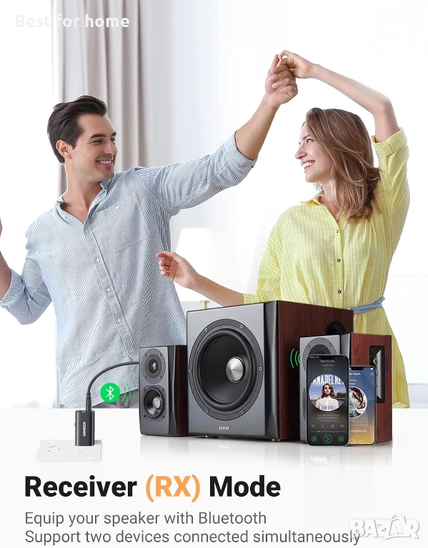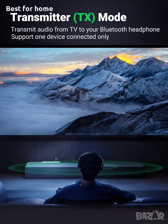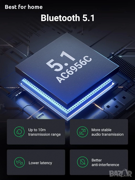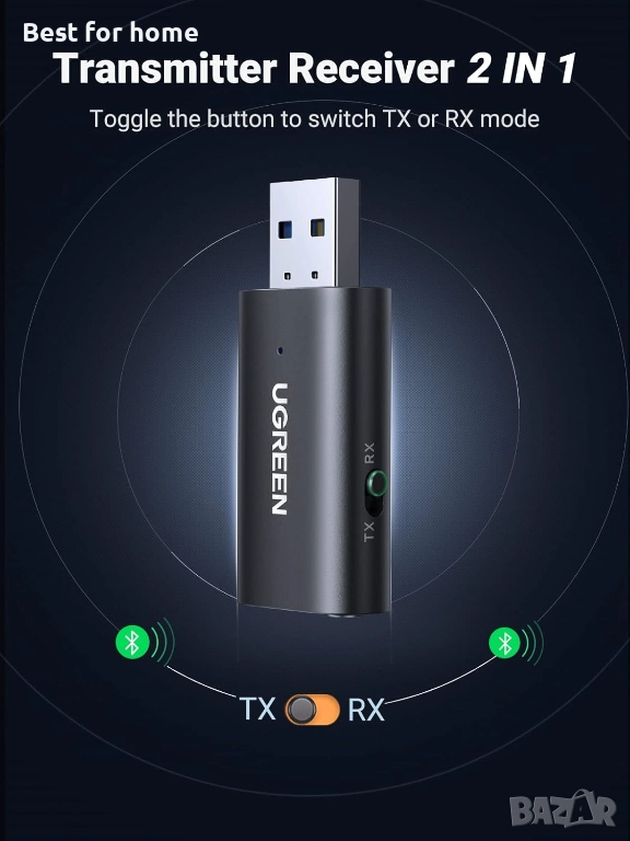 【Насладете се на безжична свобода】UGREEN Bluetooth 5.1 аудио трансивърът може лесно да добави Bluetooth функция към вашия телевизор/компютър/кола, да установи безжична връзка и да предава аудио между вашия компютър/телевизор/кола и Bluetooth високоговорители/слушалки/телефон. Насладете се на безжична музика свободно в перфектно синхронизирано висококачествено звуково удоволствие.