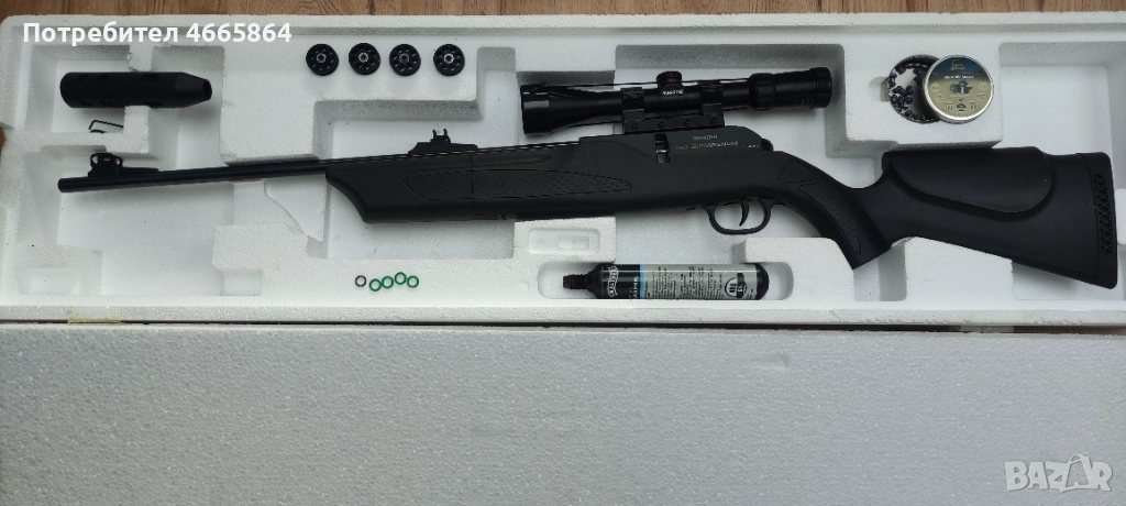 Модератор, 4 пълнителя и допълнително тунинг-бутилка 400мл,250 бара с боен клапан плюс резервни× 4 броя О пръстени за СО2 бутилката и пълнителите.