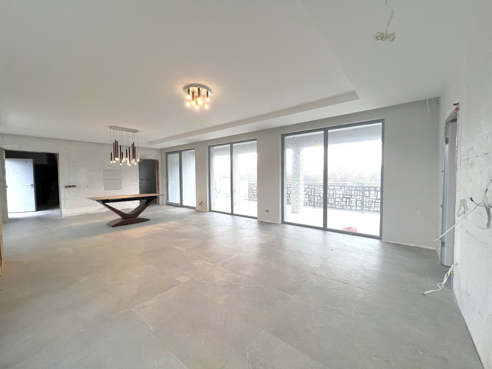 Първи етаж: входно антре около 12 кв.м., голяма дневна с трапезария около 54 кв.м. , кухня около 14 кв.м., складово помещение, веранда около 30 кв.м. с излаз на задния двор;