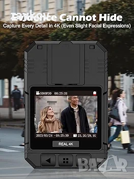 Компактен дизайн: Тази камера за тяло е проектирана за дискретна и удобна употреба, което ви позволява да заснемате изображения със свободни ръце.