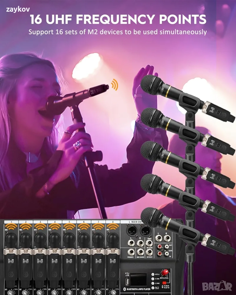 Behringer BA 19A. Изключете фантомното захранване и M2 аудио предавателят и приемникът могат да се използват за свързване на динамични микрофони. Включете фантомното захранване и M2 може да се използва за свързване на кондензаторен микрофон. Нормалното работно време е 6-8 часа. Предаване на ултра дълги разстояния: UHF лентата е оптимална за безжични микрофони, стабилна RF връзка в обхват от 50 до 80 метра (нормално), некомпресирано безжично предаване на сигнала, нисък шум и латентност. Съотношение сигнал/шум до 110 dB осигурява ясен и детайлен звук при всякаква сила на звука. Аудио с висока резолюция 24-бита / 48 kbps. Широка честотна лента от 40Hz до 20KHz. Против смущения: Безжичната микрофонна система M2 използва технология за ултрависокочестотно UHF предаване, силна защита от смущения и ултрависок честотен диапазон, гарантирайки, че гласът ви се предава стабилно и ясно към аудио приемащото устройство. Метален XLR интерфейс: Свържете различни устройства по-здраво и стабилно, като микрофони, високоговорители, миксери и PA системи. Доставя се с XLR към 1/4 адаптер, което позволява широкото използване на безжичния XLR микрофонен предавател-приемник M2 в различни сценарии на употреба. Ниска латентност / 20 честотни точки: Поддържа 20 комплекта на едно и също място едновременно. Работи с всеки динамичен/хармоничен микрофон, аудио миксер или PA система и осигурява стабилно и надеждно безжично предаване. Латентност по-малка от 6 ms (нормално), едновременно излъчване на 20 канала, идеално за места за събития, сватби и мобилни диджеи