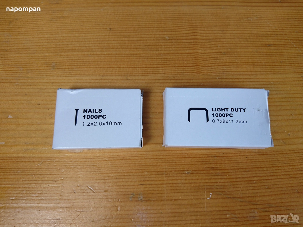Пистолетът за тапициране работи както със скоби (0.7мм Х 8мм Х 11.3мм) така и с пирони (1.2мм Х 2.0мм Х 10мм). В комплекта има 100 броя скоби и 100 броя пирони (част от скобите са използвани но повечето са налични).