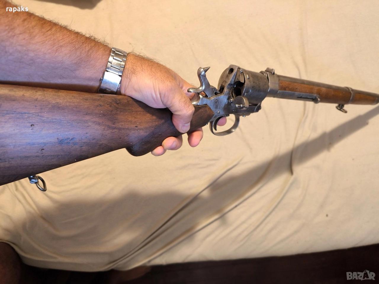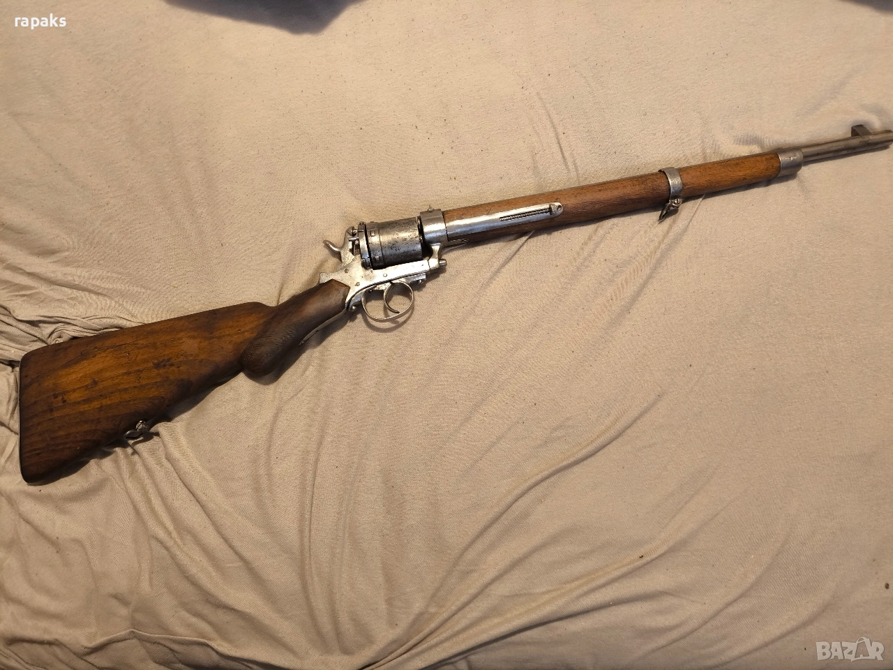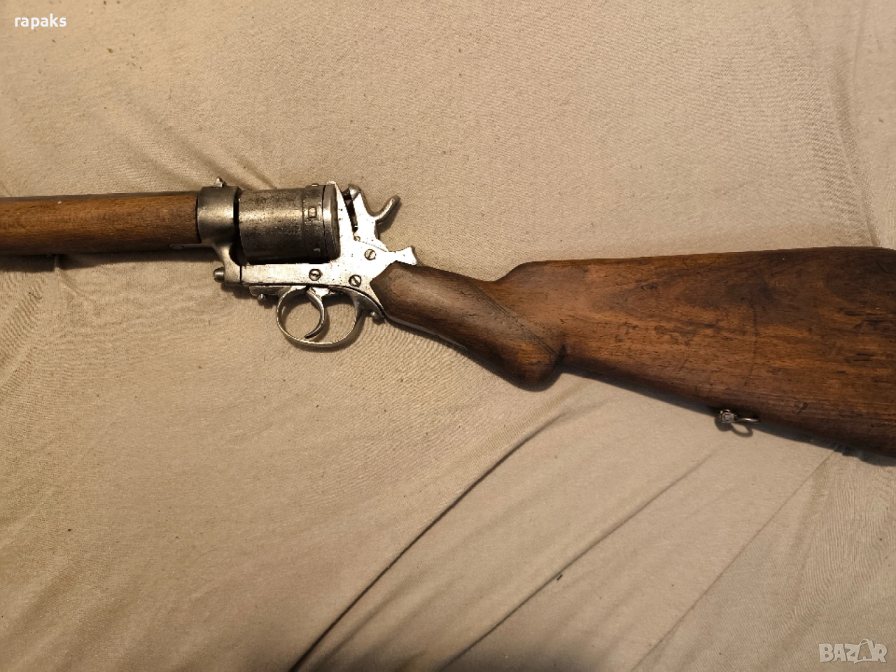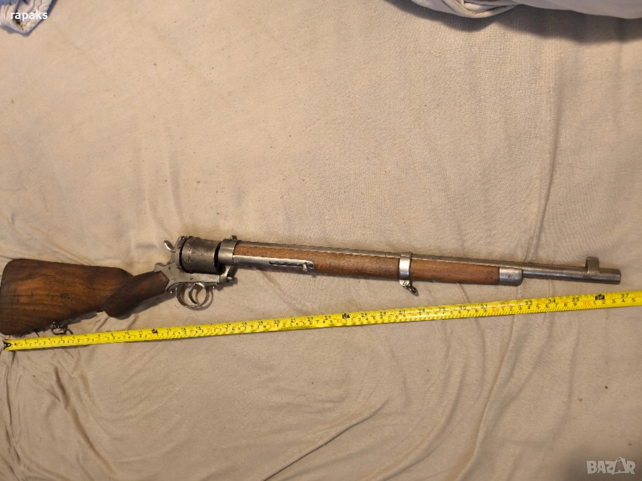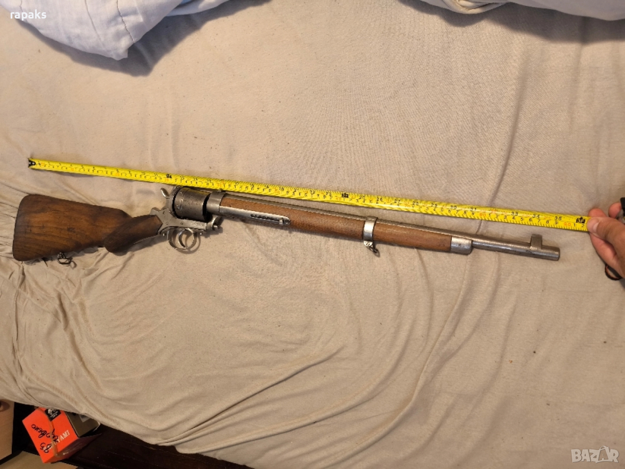 Револверна карабина Гасер 1870 Уникална карабина в прекрасно техническо и визуално състовние. Колекционерско оръжие с уникален външен вид и коректно работещи механизми. Цевта не е снаждане, калибър 11 мм, и здрава дървения без червояди, пуктнато и лепено. Механиката е стегната и работи прекрасно. Оръжието предназначено за черен барут и не облечен оловен куршум, както и е произведен далеч преди 1900 г. С две думи той е напълно - СВОБОДЕН ЗА ПРИТЕЖАНИЕ. Старинно колекционерско оръжие подходящо за възстановки, декорация и украса. Без нужда от разрешителни. Продавам и други оръжия на свободен режим, за това разгледайте обявите ми и се наслаждавайте