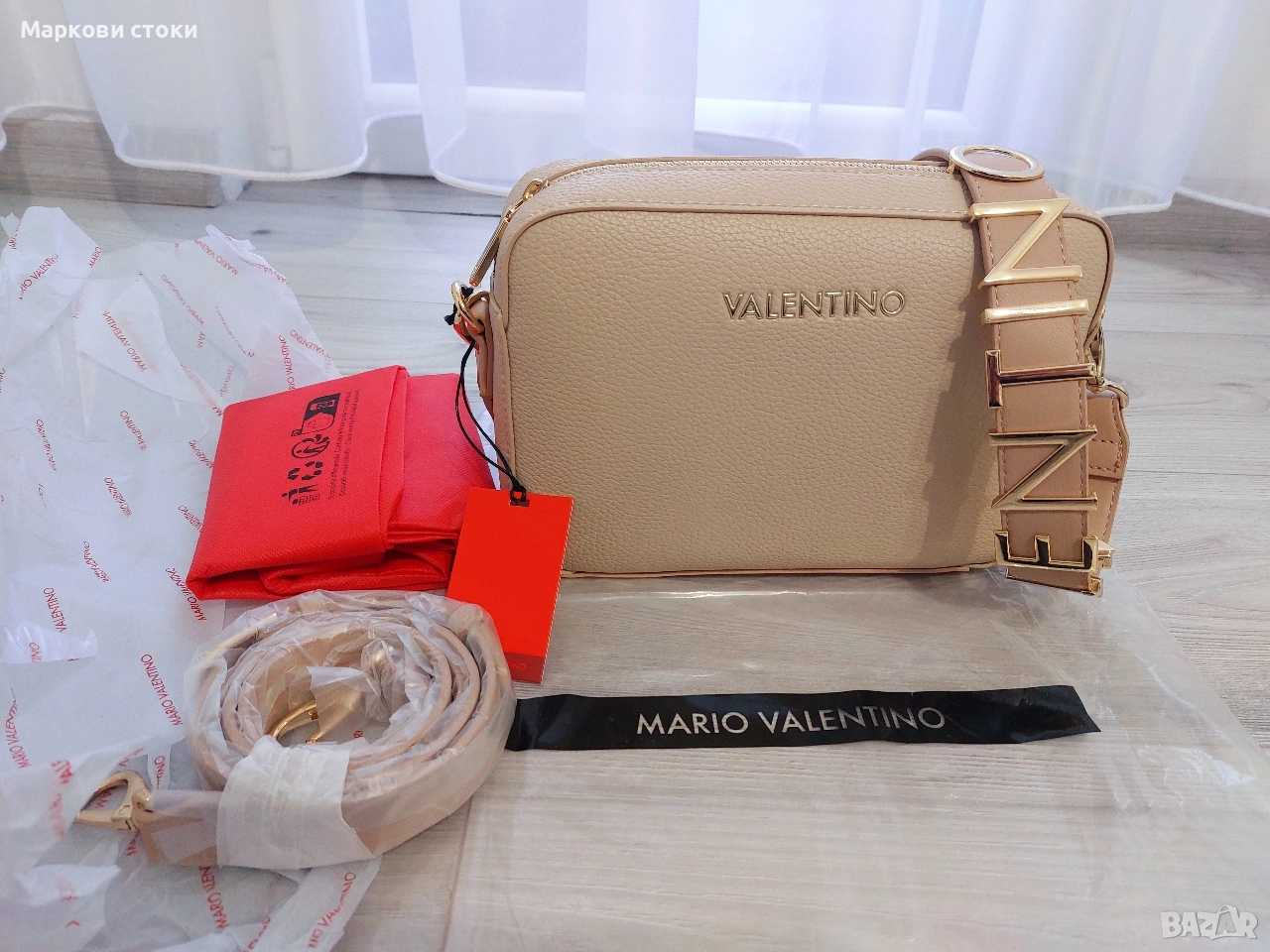Продавам оригинална чанта Mario Valentino, бежов цвят, напълно нова, с етикет и цялата оригинална опаковка. Комплектът включва: *широка лента с метални букви VALENTINO * дълга регулируема дръжка *оригинална торбичка Много красива, модерна и удобна. Подходяща за ежедневие или подарък. Размери: ~23 × 16 × 8 см Състояние: чисто нова Цена: 150лв Изпращам с Еконт с преглед и тест.