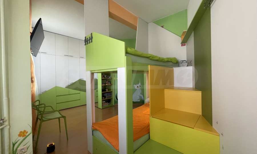 Кухнята е отделна, голяма и напълно оборудвана с всички електроуреди. Детската стая е просторна и разполага с двуетажно легло, подходящо за две деца и дизайнерски мебели по индивидуален проект. Банята е удобна и голяма, а килерът осигурява практично допълнително място за съхранение. За всички любители на спорта във вестибюла има обособен кът за спорт с монтиран тренажор с лост за набиране.