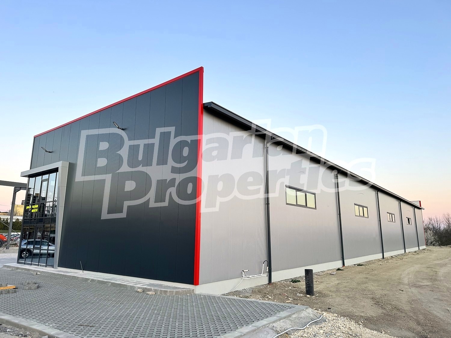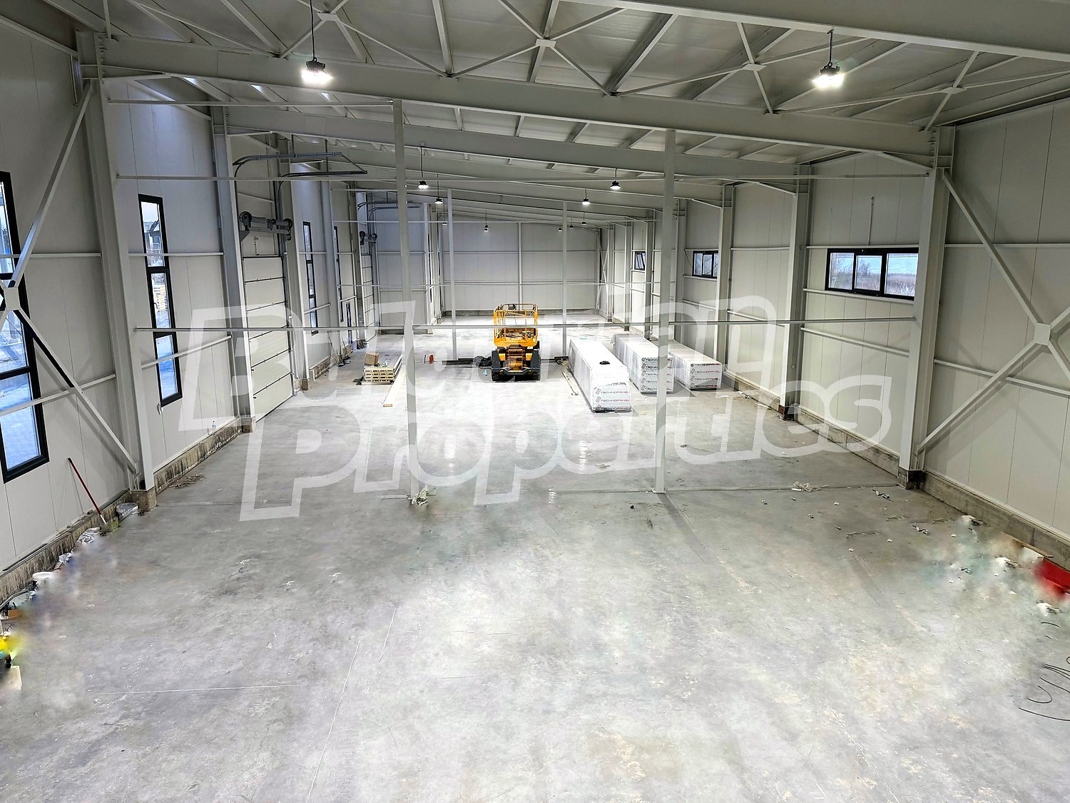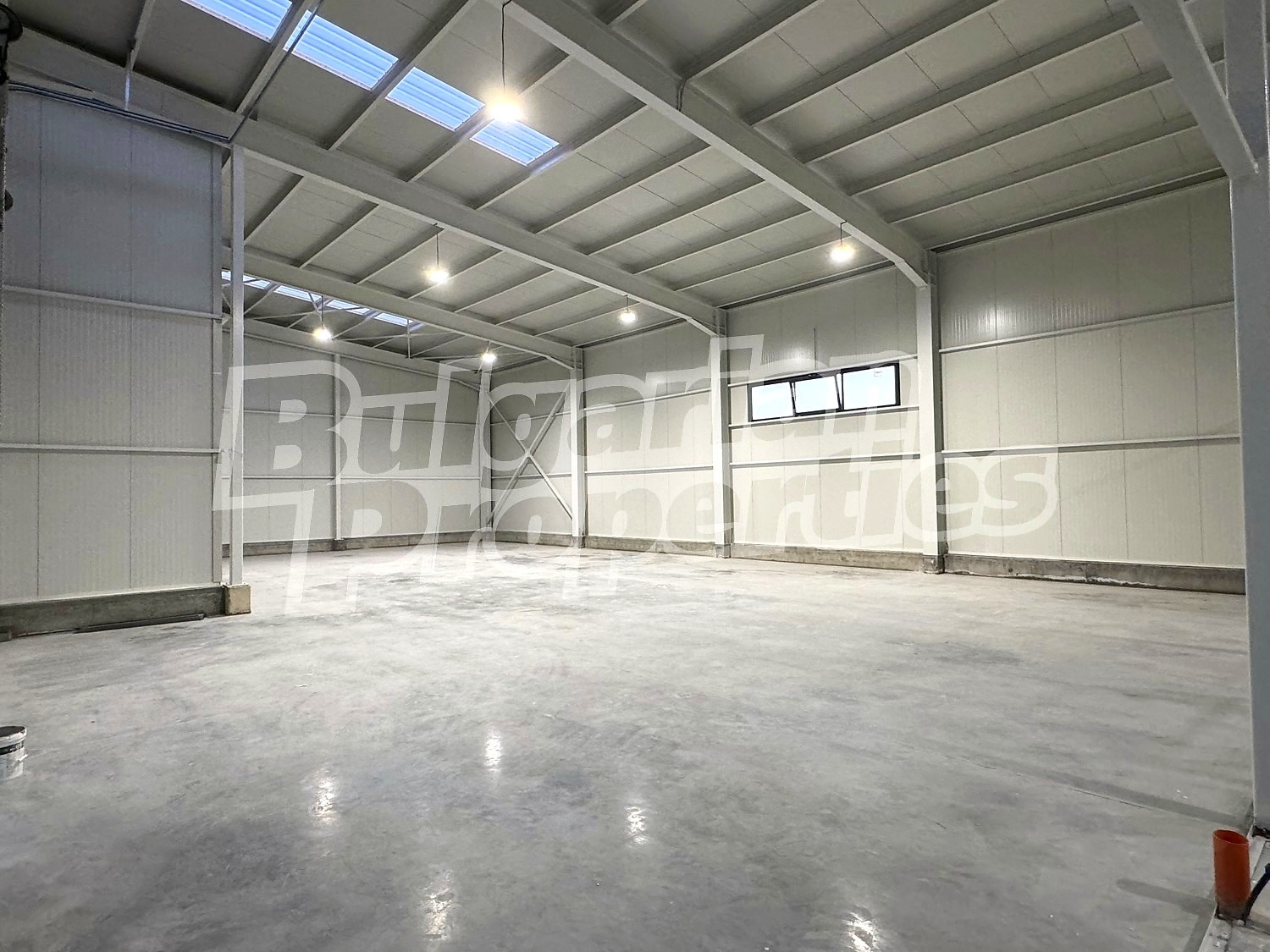 Имотът със застроена площ 900 кв.м. и височина 7.5 метра разполага с три броя ролетни врати за товаро-разтоварна дейност. Във вътрешната част е разположен офис на 2 етажа, площ 20 кв.м и 30 кв.м, с изграден санитарен възел.