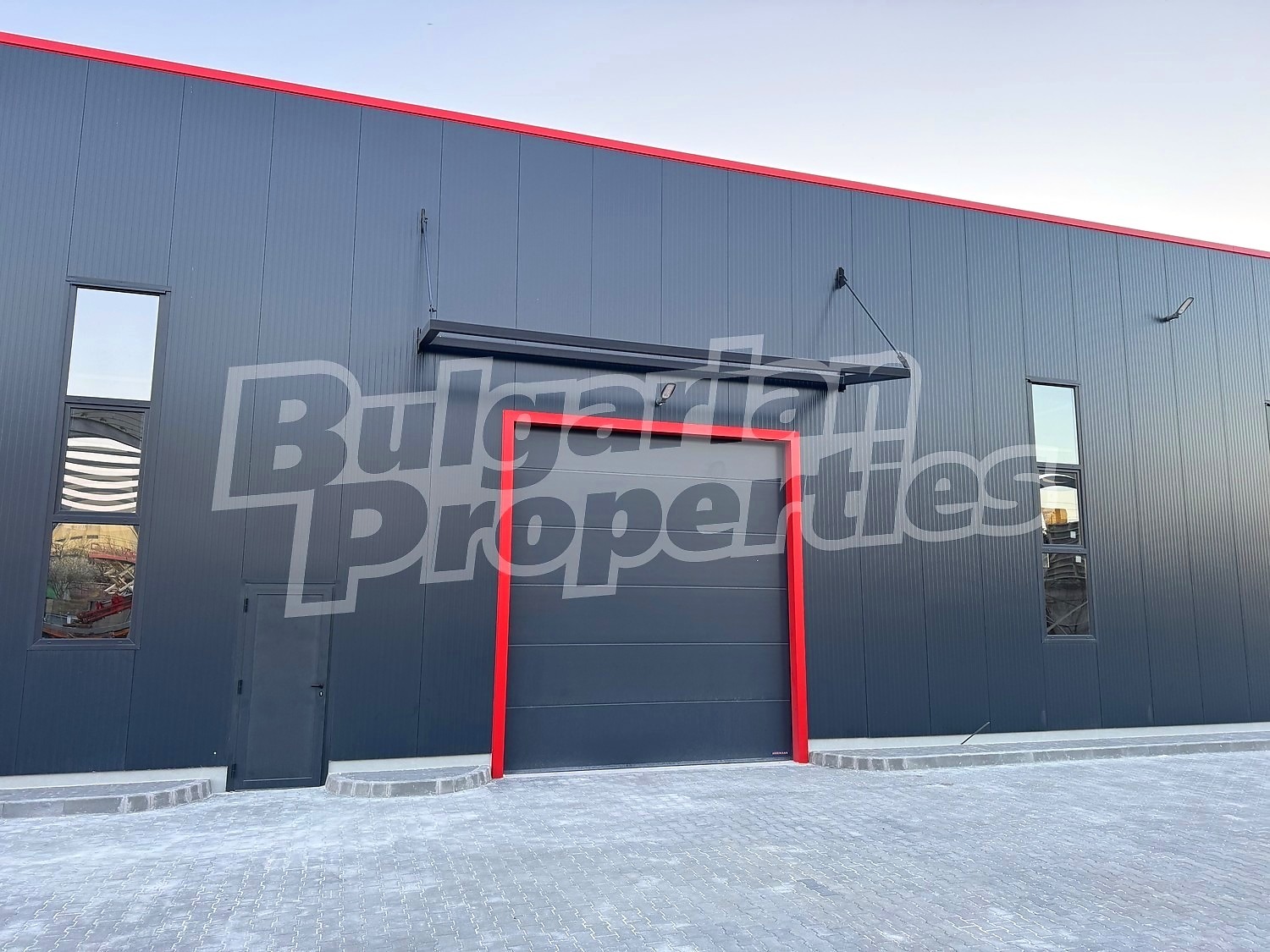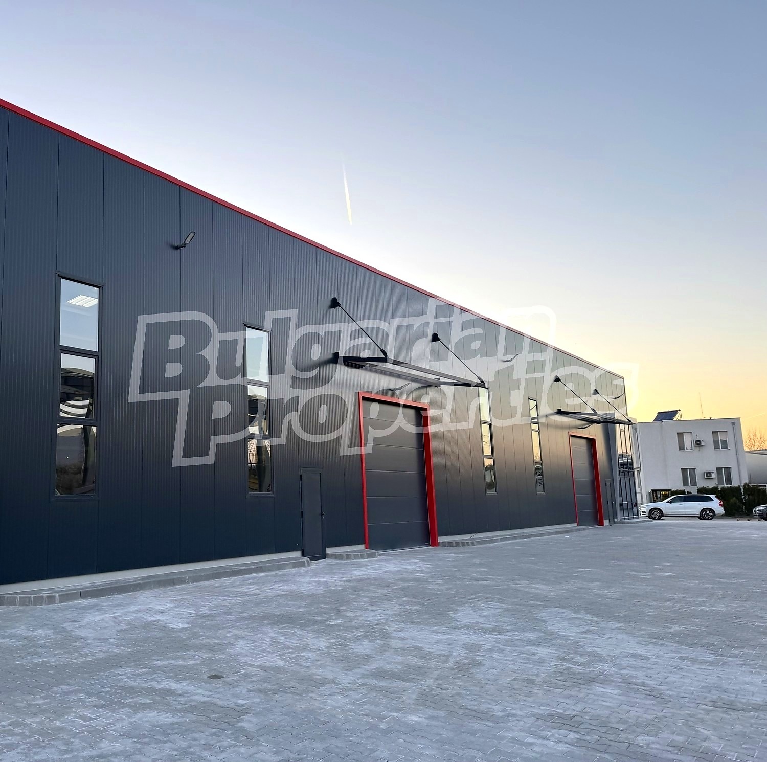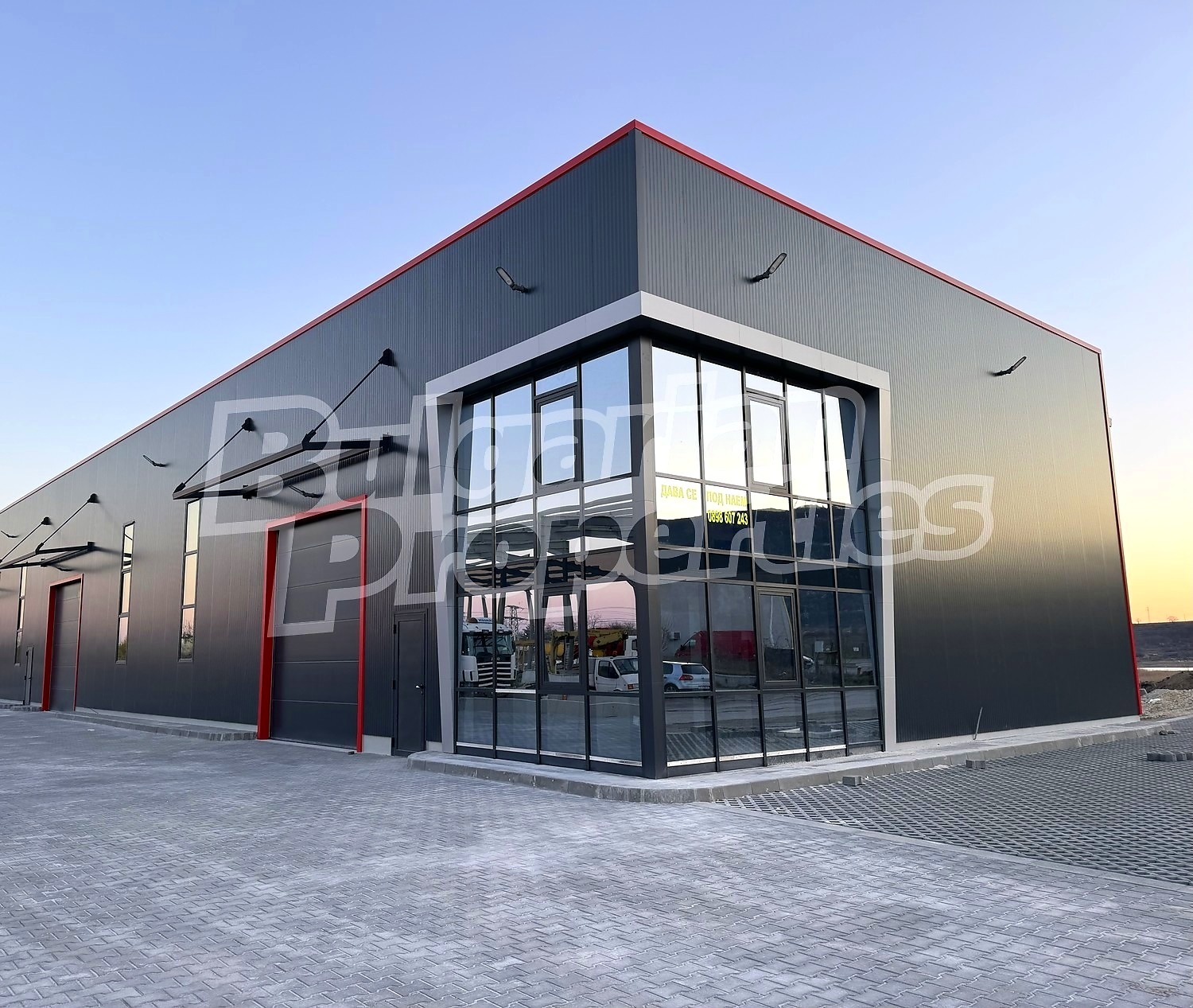 Имотът със застроена площ 900 кв.м. и височина 7.5 метра разполага с три броя ролетни врати за товаро-разтоварна дейност. Във вътрешната част е разположен офис на 2 етажа, площ 20 кв.м и 30 кв.м, с изграден санитарен възел.