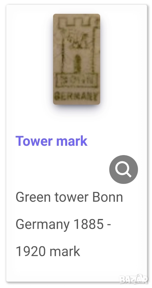 Маркировка със зелената кула е използвана в периода 1885-1920 г. Фабриката по-късно става част от Villeroy & Boch.