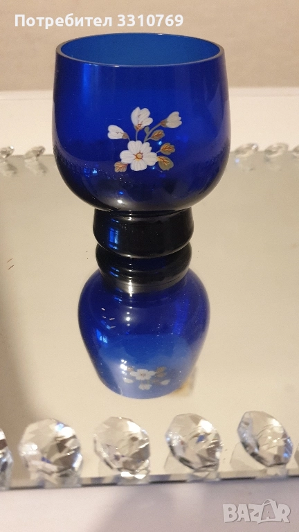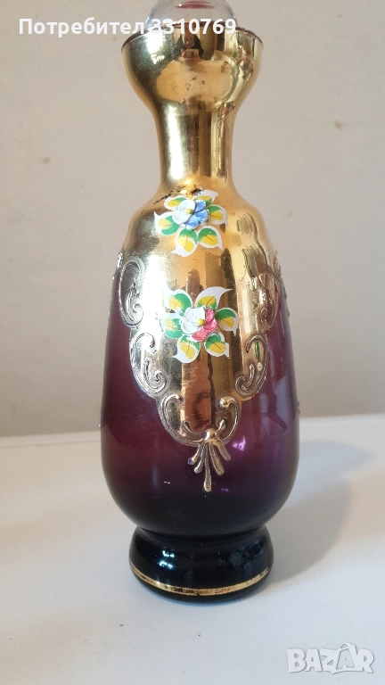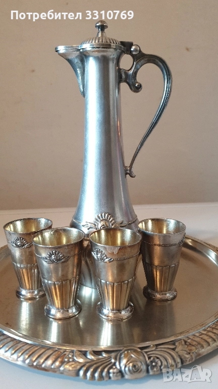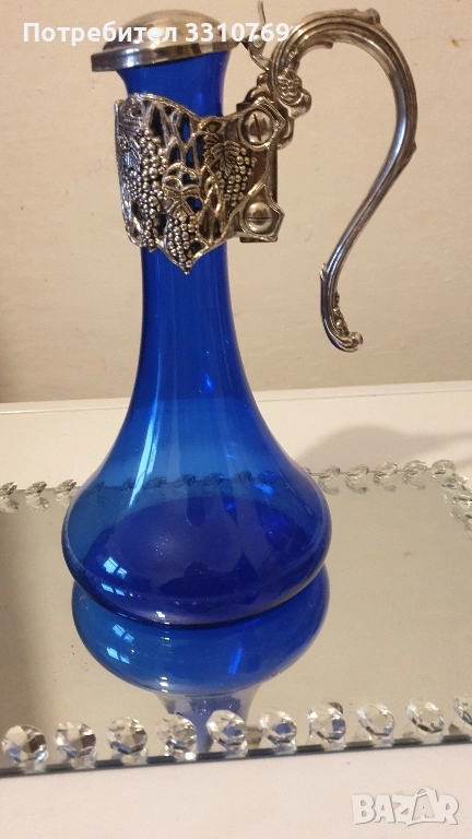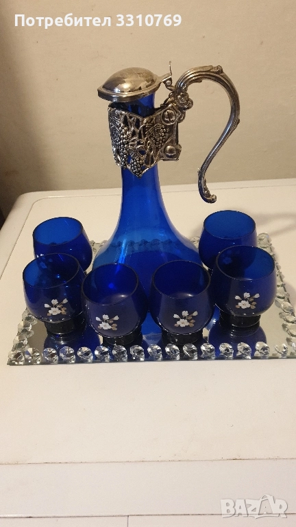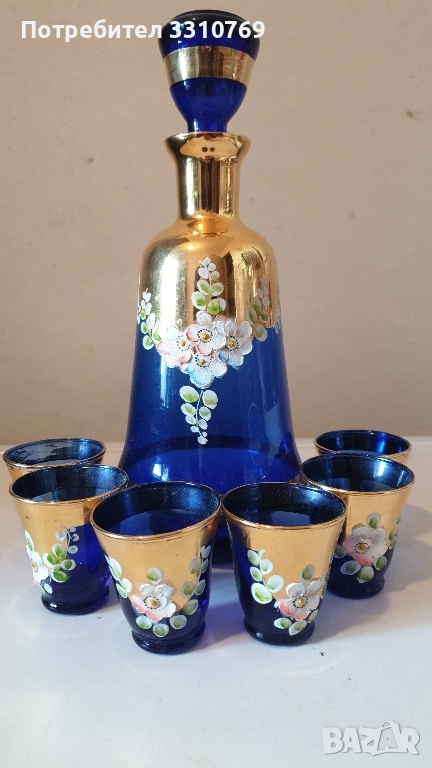 Сервиз1-кристален,ръчно изработен и рисуван с емайл и злато, височина на гарафата Нг=24см.,ви- сочина на чашката Нч= 7см.,обем на гарафата- О=0,75л.,цена Ц=100€. Бохемия, Чехия. Сервиз 2-кристален,ръчно изработен и рисуван с емайл и злато, Нг=27см., Нч=5см.,О=0,75л.Ц=110€. Мурано,Венеция. Сервиз3- кристален,ръчно изработен и рисуван с емайл, кобалт и злато , Нг=23см.Нч=5см.О=0,75л Ц=150€.Бохемия,Чехия. Сервиз4-посребрен ,антикварен (има дата на подноса)Нг=20см.,Нч=5,5см.,диаметър на подноса Дп=24см.Ц=250€. има. печат WMF Германия. Сервиз5- посребрен,антикварен, Нг=16см.,Нч=3см.,О=0,5л Ц=60€. печат(не се чете). Сервиз 6-руски кристален сервиз за коняк,ликьор и ракия върху огледален поднос с изкуствени диаманти, гарафата е с посребрен обков Нг=24см.,Нч=7,5см.,Дч=5,5см.,О=0,75л.,поднос с размери 30/20см.Ц=100€. За колекционери и ценители на красотата на художествени изделия!