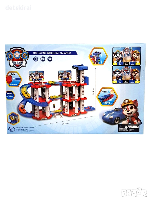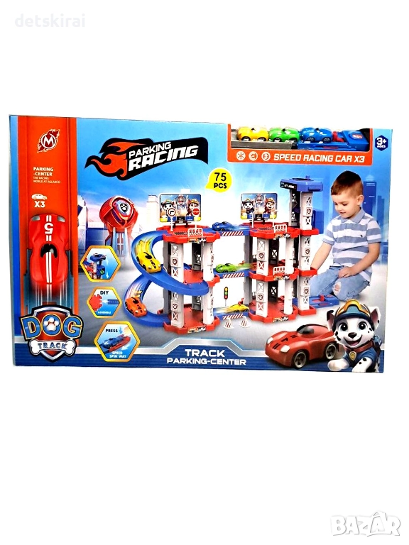 Този продукт е във формата на многоетажен паркинг, който се състои от 75 части и има 3 Етажа : партер + 2 етажа . 2 изстрелвачки и 3 коли за изстрелване.