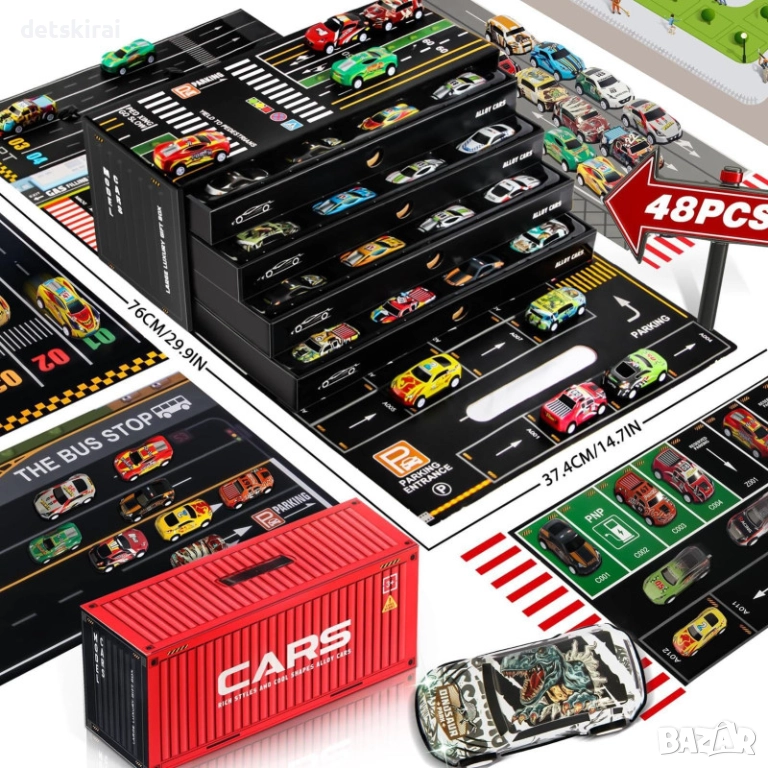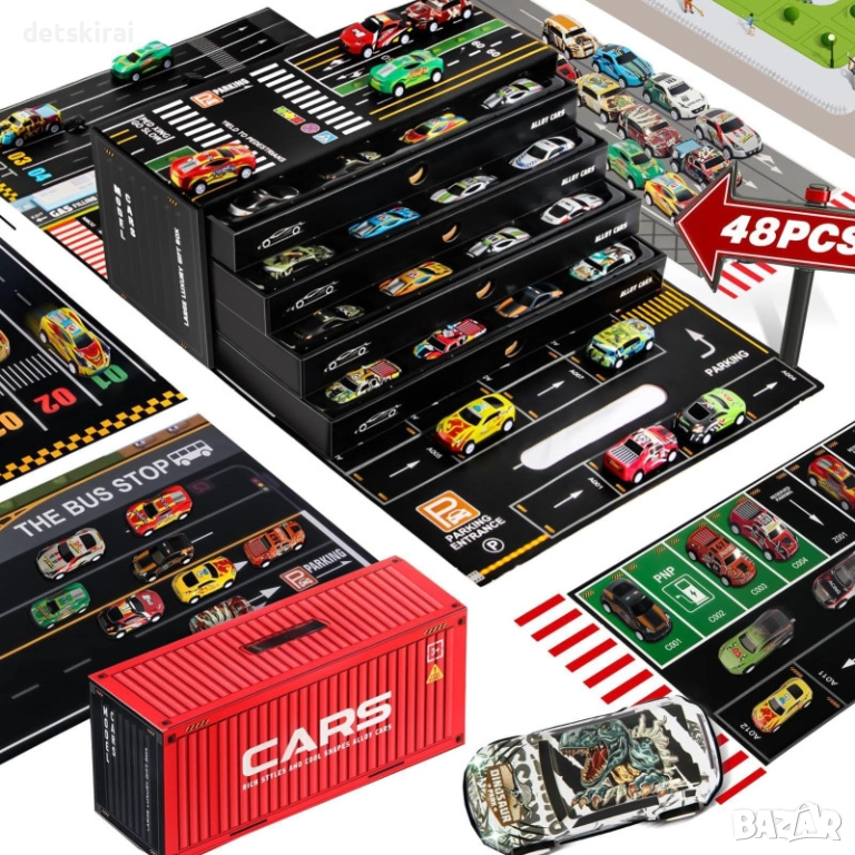 Когато се разтвори, контейнерът разкрива вътрешните си рампи и паркоместа, превръщайки се в център на действието. Огромният набор от 48 колички гарантира разнообразие и възможност за споделена игра с приятели или братя и сестри. Добавеното килимче за игра с илюстрации на улици и сгради разширява света на играта извън самия контейнер. Здрав, лек и с удобна дръжка, този комплект учи децата на организация, като същевременно им предоставя часове наред творческа игра.